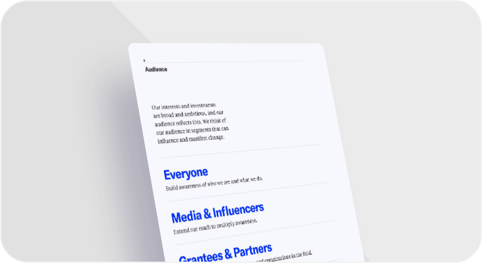 8 8 Audience Our interests and investments are broad and ambitious, and our audience reflects this. We think of our audience in segments that can influence and manifest change. Build awareness of who we are and what we do. Everyone Extend our reach to multiply awareness. Media & Influencers Attract, guide, and promote experts and organizations in the field. Grantees & Partners Influence and support individuals who can make change happen. Policy Makers