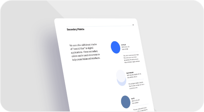 21 RGB: 49, 112, 255 Hex: #3170ff RGB: 246, 248, 254/216, 227, 251 Hex: #f6f8fe, #d8e3fc This color is used on screen when blue text appears on a black background. It reads as Arnold Blue, but is more legible on black. We use lighter washes of Arnold Blue for subtle background colors and stroke colors. ALT BLUE BLUE WASHES We use a few additional shades of “Arnold Blue” in digital applications. These secondary colors can be used on screens to help create balanced interfaces. Secondary Palette RGB: 92, 123, 169 Hex: #5c7ba9 We use a desaturated version of Arnold Blue for text that we want to appear lighter than the predominant body text. For example, we would use this color for image captions. SLATE