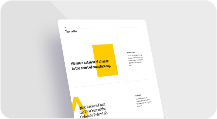 26 We are a catalyst of change in the court of complacency. Q&A: Lessons From the First Year of the Colorado Policy Lab GRANT DOLLARS $1 BILLION Type In Use Use GT America Bold for page headers. Try hanging the type over the edge of a photograph, illustration, or solid color block. PAGE HEADERS For story headlines, use Tiempos Headline Medium. The Arnold “A” can be layered behind it. HEADLINES When using Sharp for a headline, try pairing it with a small label set in GT America Bold. The contrast makes Sharp really shine. HIGH-IMPACT TEXT