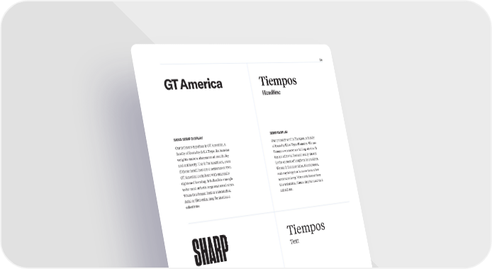 25 GT America Tiempos Headline Tiempos Text SHARP Our primary typeface is GT America, a family of fonts by Grilli Type. Its heavier weights make a statement of credibility and authority. Use it for headlines, even if those headlines are a sentence or two. GT America looks best with manually tightened kerning. It is flexible enough to be used at both large and small sizes. When this brand font is unavailable, Arial or Helvetica may be used as a substitute. Sharp is an enormous family of fonts by Sharp Type. We exclusively make use of Sharp Grotesk 10. We use it for big numbers and data, or for huge headers. A good rule of thumb is to not set more than five words in Sharp. Longer headlines should use GT America. Sharp should always be set in CAPS. No substitutes for this typeface should be used if it is unavailable. Our primary serif is Tiempos, a family of fonts by Klim Type Foundry. We use Tiempos when we are telling stories. It has an editorial feel and really shines in the context of longform journalism. We use it for story titles, blockquotes, and anything that is more than a few sentences long. When this brand font is unavailable, Times may be used as a substitute. For body text or anything below 20pt, we use Tiempos Text. It has all the character of Tiempos Headline, but is designed to be highly legible at smaller sizes, especially on the web. We use it for story excerpts, body text, caption text, and the text that you are reading right now. When this brand font is unavailable, Times may be used as a substitute. SANS SERIF DISPLAY NUMBERS & BIG WORDS SERIF DISPLAY SERIF TEXT