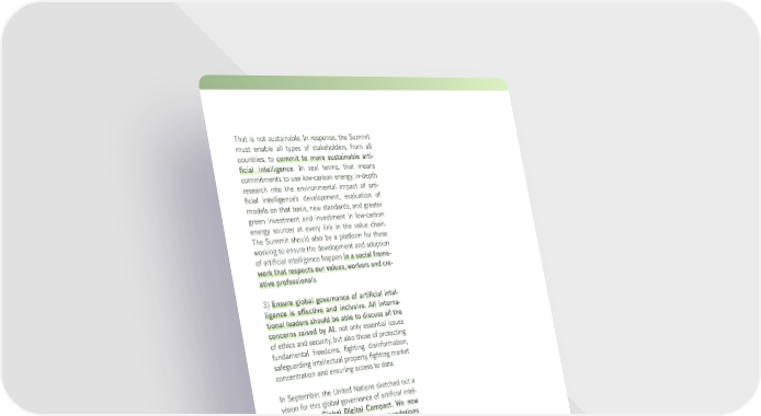 15 That is not sustainable. In response, the Summit must enable all types of stakeholders, from all countries, to commit to more sustainable arti- ficial intelligence . In real terms, that means commitments to use low-carbon energy, in-depth research into the environmental impact of arti- ficial intelligences development, evaluation of models on that basis, new standards, and greater green investment and investment in low-carbon energy sources at every link in the value chain. The Summit should also be a platform for those working to ensure the development and adoption of artificial intelligence happen in a social frame- work that respects our values, workers and cre- ative professionals . 3) Ensure global governance of artificial intel- ligence is effective and inclusive. All interna- tional leaders should be able to discuss all the concerns raised by AI : not only essential issues of ethics and security, but also those of protecting fundamental freedoms, fighting disinformation, safeguarding intellectual property, fighting market concentration and ensuring access to data. In September, the United Nations sketched out a vision for this global governance of artificial intel- ligence in a Global Digital Compact. We now want to help implement its recommendations . Private stakeholders and civil society actors must be included in this reflection, so that together an international AI governance structure can be implemented that combines the many challenges linked to this technology.