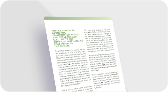 11 FRANCE PRODUCES ABUNDANT, COMPETITIVELY PRICED AND DECARBONIZED ELECTRICITY, FOR ARTIFICIAL INTELLIGENCE THAT PROTECTS THE CLIMATE. Some 93% of the electricity produced in France was decarbonized in 2023. In his 2022 Belfort speech, the President set a clear course to consol- idate Frances leadership in the energy transition, with two priorities: massive development of renew- able energy sources and new momentum for the nuclear sector. Today, this priority is clear in the objectives to deploy 100 GW of solar capacity and 40 GW of offshore wind capacity by 2050, when it comes to renewables, and in the announcement of six new nuclear reactors. These investments will ensure France remains a massive producer of decarbonized energy. Having exported a net 89 TWh in 2024, France beat its own historic record, helping its European neighbours to achieve our Paris Agreement climate goals. With its very competitive current nuclear power infrastructure, massive investment in solar and wind power, and a very large and robust high and very high voltage power grid which enjoys constant investment, France offers very condu- cive economic conditions for projects requir- ing large quantities of clean electricity, such as data centres. In the context of the reform of the European electricity market and the regulatory framework replacing the French mechanism for regulated access to historic nuclear energy capac- ity (ARENH), the French Government has made the reforms needed to guarantee competitive and stable prices for businesses, protecting them from volatility linked to oil and gas prices. Several types of contract are available to countries requiring a lot of electricity, helping guarantee stable and competitive prices for five to fifteen years. This modern energy policy, seen by many actors as being at the forefront when it comes to address- ing climate and competitiveness challenges, as well as Frances good geographical position at the heart of Europe, makes the country a strategic hub for data centres, boosted by major invest- ment in supercomputers like Jean Zay and the future Alice Recoque exascale computer. Private companies like OVHcloud and Scaleway, as well as international actors like Microsoft, Amazon and Telehouse, have also invested massively in France. The bill on simplifying the business environment that will be soon be tabled before the French par- liament includes a measure to classify data cen- tres as projects of major national interest (PINM), enabling expedited administrative procedures. Government-secured PINMs enjoy faster author- ization procedures for planning and access to the electricity grid. Thanks to exceptional talents, a vibrant ecosys- tem and an ethical vision, France has earned its place as a global leader in artificial intelligence. Driven by its ambitious strategy and structural investments, it is in a position to rival the great AI nations while deploying its own vision for the technologies.