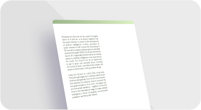 7 Moreover, this Summit will be a week of tangible action. It is time for us to ensure, together, that the public interest is central to the development of artificial intelligence. In Paris, promotion of public interest AI will include the showcasing of 50 innovative projects addressing the sustainable development goals (SDGs). It will also include the launch of a large-scale initiative aimed at making access to artificial intelligence more equal across the world. This Summit will be an opportunity to get to grips with essential issues, including the quality of public and democratic debate and access to information in the generative AI age. Lastly, this Summit is a call to take a long view: firstly, through longer-term initiatives, which we will promote energetically from the Summit onwards; and secondly, the absolute need to conceive the two great transitions of our time the digital and environmental transitions together for the first time on the international stage, to make artificial intelligence a driver of progress, environmental protection and the public interest.