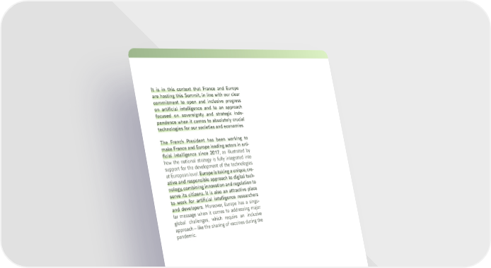 13 It is in this context that France and Europe are hosting this Summit, in line with our clear commitment to open and inclusive progress on artificial intelligence and to an approach focused on sovereignty and strategic inde- pendence when it comes to absolutely crucial technologies for our societies and economies . The French President has been working to make France and Europe leading actors in arti- ficial intelligence since 2017 , as illustrated by how the national strategy is fully integrated into support for the development of the technologies at European level. Europe is taking a unique, cre- ative and responsible approach to digital tech- nology, combining innovation and regulation to serve its citizens. It is also an attractive place to work for artificial intelligence researchers and developers . Moreover, Europe has a singu- lar message when it comes to addressing major global challenges, which require an inclusive approach like the sharing of vaccines during the pandemic.