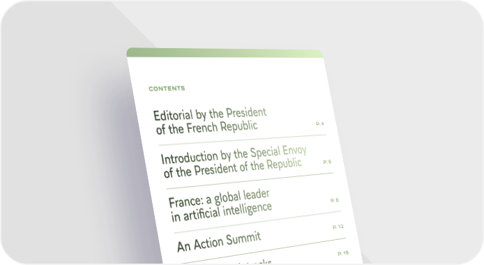 CONTENTS Editorial by the President of the French Republic P. 4 Introduction by the Special Envoy of the President of the Republic P. 6 France: a global leader in artificial intelligence P. 8 An Action Summit P. 12 Five key work tracks P. 18 A unique, inclusive approach P. 23 Programme P. 24 Press information P. 25