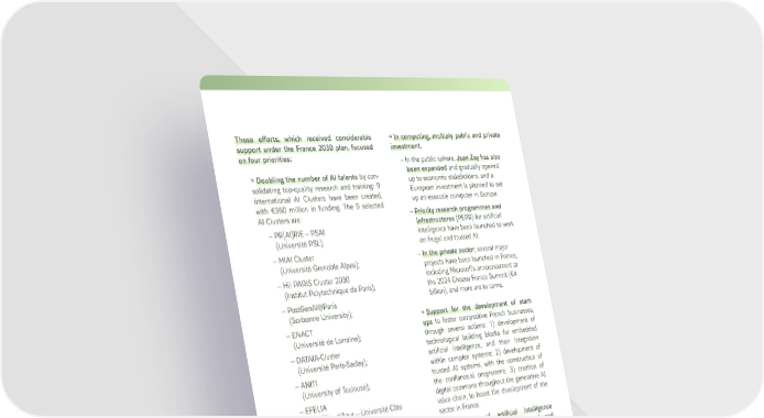 9 These efforts, which received considerable support under the France 2030 plan, focused on four priorities: Doubling the number of AI talents by con- solidating top-quality research and training: 9 international AI Clusters have been created, with 360 million in funding. The 9 selected AI Clusters are: PR[AI]RIE PSAI (Universit PSL); MIAI Cluster (Universit Grenoble Alpes); Hi! PARIS Cluster 2030 (Institut Polytechnique de Paris); PostGenAI@Paris (Sorbonne University); ENACT (Universit de Lorraine); DATAIA-Cluster (Universit Paris-Saclay); ANITI (University of Toulouse); EFELIA (3IA Cte dAzur Universit Cte dAzur); SequoIA (University of Rennes). These investments have considerably strength- ened the artificial intelligence research and train- ing ecosystem across France. They should help combine this training, research and innovation quality to foster the emergence of academic leaders in France. The aim for 2030 is to train 100,000 people, including 20,000 in continuing training , and to ensure at least one of our centres of excellence features in the leading international rankings. In computing, multiply public and private investment. In the public sphere, Jean Zay has also been expanded and gradually opened up to economic stakeholders, and a European investment is planned to set up an exascale computer in Europe. Priority research programmes and infrastructures (PEPR) for artificial intelligence have been launched to work on frugal and trusted AI. In the private sector , several major projects have been launched in France, including Microsofts announcement at the 2024 Choose France Summit (4 billion), and more are to come. Support for the development of start- ups to foster competitive French businesses, through several actions: 1) development of technological building blocks for embedded artificial intelligence, and their integration within complex systems; 2) development of trusted AI systems, with the construction of the confiance.ai programme; 3) creation of digital commons throughout the generative AI value chain, to boost the development of the sector in France. Deployment of artificial intelligence throughout companies: align AI supply and demand and thus speed up the adoption of the technologies in companies, including through the AI Booster programme. Open source projects and the development of frugal artificial intelligence demonstrators supporting the ecological transition at local levels also help to ensure these technologies serve the many and the public good. In addition to becoming Europes leading gener- ative AI hub, France has risen from 13th place in the Global AI Index in 2023 to 5th place in 2024. Concerning the public-sector led dimension of the strategy (research, training and infrastructure), France has risen from 5th place globally in the 2021 Global AI Vibrancy Ranking to 3Rd in 2023..