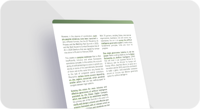 22 However, in the absence of coordination, multi- ple parallel initiatives have been launched in very different formats, like the G7 Hiroshima AI Process and the Bletchley Park Summit in 2023, and the Tech Accord to Combat Deceptive Use of AI in 2024 Elections that was signed by compa- nies alone in Munich in February 2024. This creates a complex landscape that is often insufficiently inclusive and where frameworks sometimes compete. In this context, the account- ability of artificial intelligence actors is upheld very strictly in terms of the commitments demanded of them and at the same time very loosely due to the lack of competent control institutions. Meanwhile, various norms co-exist depending on the regions concerned, which penalizes smaller actors that are less well-equipped to navigate between legal systems. Echoing the vision for more inclusive and effective governance of artificial intelligence promoted by the Global Digital Compact, which now needs to be established tangibly, the primary aim of the Summit in this area is to clarify and design a shared and effective gov- ernance framework with all relevant actors so that science, solutions and standards are bet- ter shared. Inclusiveness is the watchword . Today, only seven countries worldwide are participating in the major international artificial intelligence ini- tiatives, while 119 are totally absent from them. Moreover, private actors and civil society need to be fully included in this governance, which must not be restricted to public authorities alone. As such, the chosen approach is a collective one , involving many consultations with various stakeholders from across the world. The aim is clear: to build a consensus on the global gov- ernance framework for artificial intelligence, with and for all parties . With 70 partners, including States, international organizations, businesses and civil society rep- resentatives, the aim is to survey the artificial intelligence governance system s needs, actors, fundamental principles, limits and room for progress. One single governance initiative is not the answer . Rather, existing initiatives, like the Global Partnership on Artificial Intelligence (GPAI) that will meet in an expanded format on on 9 February with the Minister for Europe and Foreign Affairs, Jean-Nol Barrot, to agree on a new action plan for 2025, need to be coordinated to build a global, multi-stakeholder consensus around an inclusive and effective governance system for artificial intelligence.