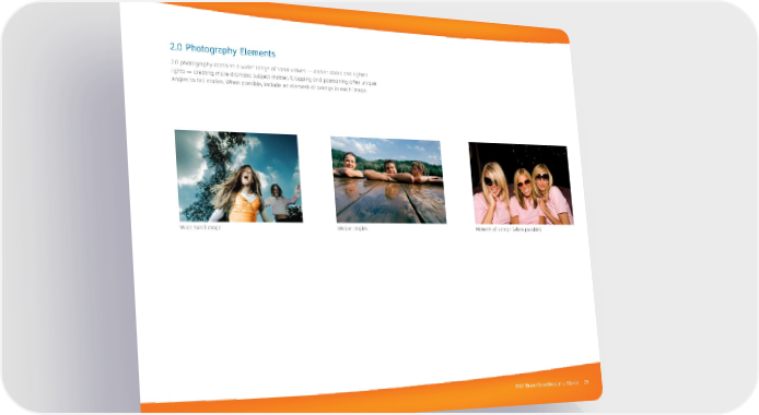 AT&T Brand Guidelines at a Glance 25 2.0 Photography Elements 2.0 photography contains a wider range of tonal values — darker darks and lighter lights — creating more dramatic subject matter. Cropping and positioning offer unique angles to tell stories. When possible, include an element of orange in each image. Wide tonal range Unique angles Element of orange (when possible)