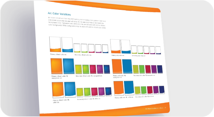 AT&T Brand Guidelines at a Glance 17 Primary vibrant color arc Secondary vibrant color arc Primary solid color arc Secondary solid color arc Primary vibrant color fill, white arc Secondary vibrant color fill, white arc Primary solid color fill, white arc Secondary solid color fill, white arc Primary vibrant color fill, transparent arc Secondary vibrant color fill, transparent arc Primary solid color fill, transparent arc Secondary solid color fill, transparent arc Arc Color Variations Arc colors are derived from the AT&T primary and secondary color palettes. Both solid and vibrant colors may be used with arcs. Do not use arc(s) that do not match the background color. Transparent and white arcs may also be used with solid or vibrant color backgrounds. White backgrounds may be used with solid or vibrant color arc(s).