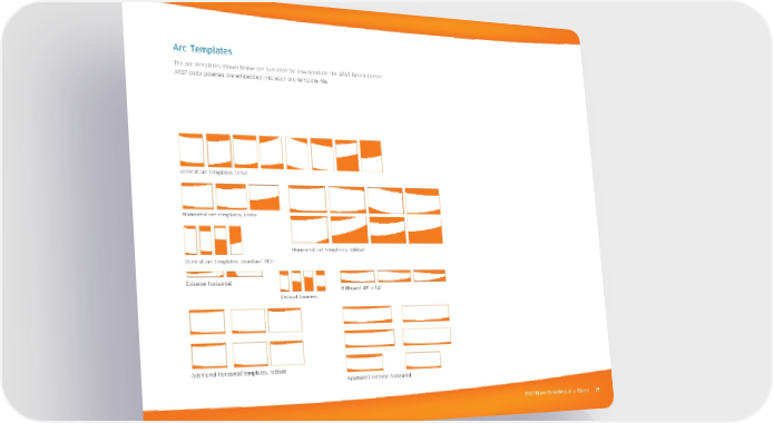 AT&T Brand Guidelines at a Glance 18 Arc Templates The arc templates shown below are available for download on the AT&T Brand Center. AT&T color palettes are embedded into each arc template file. Horizontal arc templates, letter Horizontal arc templates, tabloid Vertical arc templates, letter Vertical arc templates, standard #10 Additional horizontal templates, tabloid Additional extreme horizontal Extreme horizontal Vertical banners Billboard 48’ x 14’