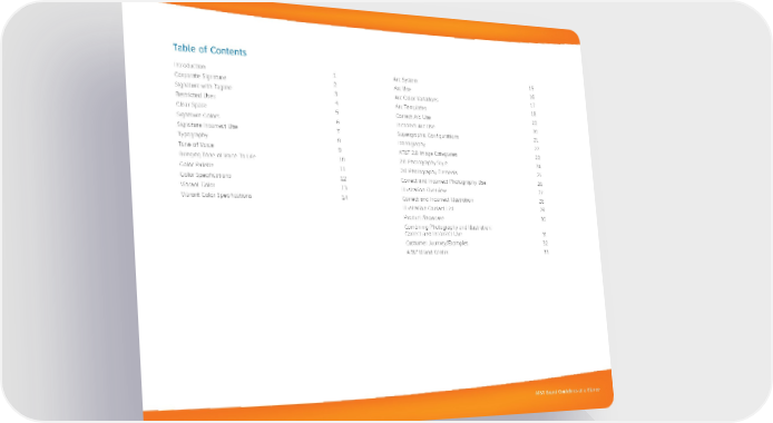 AT&T Brand Guidelines at a Glance Table of Contents Introduction 1 Corporate Signature 2 Signature with Tagline 3 Restricted Uses 4 Clear Space 5 Signature Colors 6 Signature Incorrect Use 7 Typography 8 Tone of Voice 9 Bringing Tone of Voice To Life 10 Color Palette 11 Color Specifications 12 Vibrant Color 13 Vibrant Color Specifications 14 Arc System 15 Arc Use 16 Arc Color Variations 17 Arc Templates 18 Correct Arc Use 19 Incorrect Arc Use 20 Supergraphic Configurations 21 Iconography 22 AT&T 2.0 Image Categories 23 2.0 Photography Style 24 2.0 Photography Elements 25 Correct and Incorrect Photography Use 26 Illustration Overview 27 Correct and Incorrect Illustration 28 Illustration Contact List 29 Product Showcase 30 Combining Photography and Illustration: Correct and Incorrect Use 31 Customer Journey/Examples 32 AT&T Brand Center 33