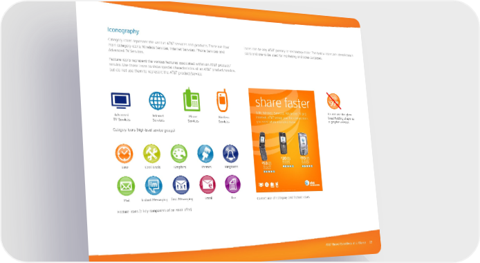 AT&T Brand Guidelines at a Glance 22 Graphics Text Messaging Ringtones Fax Themes Email Time Mail Cool Tools Instant Messaging share faster Dui bla facc um illutpat ullam iriure dipsum vullandionse te ve nt euis nim nim ea feugiatis nulpute ve le ssi ea facilisi blam eu facc umm odol ore eraesenit wisim quipit praessis aute dol or sis et in et adiam , quip esed dipit. CASH BACK! $ 70 With a palm Treo 680 with broadband-speed and multimedia phone CASH BACK! $ 20 With a Samsung A729 with broadband-speed and multimedia phone CASH BACK! $ 50 With a Samsung A117 with broadband-speed and multimedia phone With Wireless Services, Advanced TV and Internet, AT&T brings you the connections you need when you need them. Wireless Services Phone Services Only Advanced TV Services Internet Services Iconography Category icons represent the various AT&T services and products. There are four main category icons: Wireless Services, Internet Services, Phone Services and Advanced TV Services. Feature icons represent the various features associated within an AT&T product/ service. Use these icons to show special characteristics of an AT&T product/service, but do not use them to represent the AT&T product/service. Icons can be any AT&T primary or secondary color. The below icons are identification icons and are to be used for marketing and sales purposes. Do not use the glass bead holding shape as a graphic violator. Category icons (high-level service groups) Feature icons (a key component of an AT&T offer) Correct use of category and feature icons