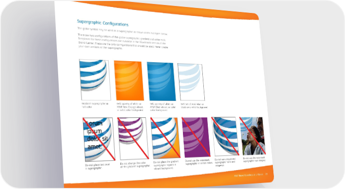 AT&T Brand Guidelines at a Glance 21 Supergraphic Configurations The globe symbol may be used as a supergraphic as shown in the examples below. There are two configurations of the globe supergraphic: gradient and watermark. Templates for these configurations are available in the Downloads section of the Brand Center. These are the only configurations that should be used. Never create your own versions of the supergraphic. 18% opacity of white on AT&T New Orange vibrant or solid color background Gradient supergraphic in full color 18% opacity of white on AT&T Blue vibrant or solid color background 18% tint of AT&T Blue or black on a white background Do not place text over a supergraphic. Do not place the gradient supergraphic against a vibrant background. Do not use the watermark supergraphic over imagery. Do not use the watermark supergraphic in accent colors. Do not change the color of the gradient supergraphic. Do not use unapproved supergraphic sizes and croppings.