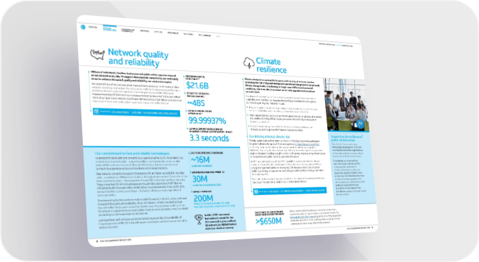 Read more: TCFD Report • CDP Climate Change disclosure • Climate Change Issue Brief AT&T AND SHAREHOLDERS CLIMATE RESILIENCE Millions o f in dividuals, f amilies, b usinesses an d public s af ety a gencies dep end on ou r netwo rk every day. T o s uppo rt t his ess ential c onnectivity, w e c ontinually invest t o en hance t he speed, quality an d reliability ou r c usto mers r equ ire. We c ollect bi llions o f service-assurance m easurements ac ross o ur w ireline a nd w ireless networks every hour and analyze this data in near-real time to help improve performance and deliver the best customer experience. Over the past 6 years (201 6 –2021), we’ve invested more than $ 135 billion in our wire less and wireline networks. 9 We’ve also shifted 100% of our layer 3 core network to software-defined control, which allows us to provision new services faster and rapidly adjust capacity in response to traffic demand. Network quality and reliability Climate resilience Our commitment to fast and reliable technologies As demand for bandwidth and connectivity surged during the COVID-19 pandemic, our network has remained stable – supporting millions as they work, learn and socialize online. AT&T continues to invest in fiber and 5G infrastructure to enable the best connectivity experience across our broadband and wireless networks. Fiber network connections support more bandwidth and faster uploads than standard cable – in addition to >99% proven reliability. Throughout 2021, we built fiber to 2.6 million new customer locations – the equivalent of nearly 300 connections per hour, every day. Today, more than 5.9 million businesses and households subscribe to AT&T Fiber for critical bandwidth to power video, collaboration, cloud services and more. And in 2022, we launched fiber service up to 5Gbps – the fastest offering among major internet service providers. Since becoming the first carrier to make mobile 5G a reality in the U.S., we’ve continued to expand the quality and availability of our 5G network – which now reaches more than 255 million Americans in more than 16,000 cities. The speed and reliability of our 5G network is supported by our leading fiber footprint, which provides critical bandwidth connecting our cell towers back to the internet. Looking ahead, we’ll continue our 5G momentum by expanding the availability of C-band spectrum (AT&T 5G+) that will support even faster connections and innovative wireless solutions. 2021 GROSS CAPITAL INVESTMENT 26 $2 1.6B PETABYTES OF TRAFFIC PER DAY (Q4 2021) ~485 LAYER 3 CORE NETWORK UPTIME IN 2 021 99.99937% LAYER 3 CORE NETWORK AVERAGE INTERRUPTION PER CUSTOMER PORT IN 2021 3.3 s e conds INVESTMENT IN OUR NETWORK DISASTER RECOVERY PROGRAM >$650M 2021 HOME INTERNET FOOTPRINT ~16M customer locations EXPANDING FIBER FOOTPRINT TO 30M customer locations by 2025 EXPECT TO REACH 200M Points of presence in the U.S. with 5G C-band spectrum by the end of 2023 Climate change is increasing the frequency and severity of extreme weather, worsening the risk of physical damage and operational disruptions to our network. Climate change is also contributing to longer-term shifts in environmental conditions, which we take into account as we make upgrades and extend our network reach. To enhance the operational resilience of our network today and help ensure future availability of our services, we integrate climate change considerations throughout our network planning. Key initiatives include: • Regular analysis to help ensure our network infrastructure, such as cell sites, data centers and wireline switching offices, can withstand natural disasters • High-capacity battery backup or permanent generators at our cell sites, data centers and wireline switching offices, helping ensure service continuity in the event of temporary power loss • Proactive monitoring of potential threats to our network, employees and infrastructure through the AT&T Weather Operations Center Considering physical climate risk To help us plan, build and maintain our network in the face of extreme weather and long-term climate change, in 2019 we developed our Climate Change Analysis Tool (CCAT). By modeling the potential for extreme weather within our geographic information system, our industry-leading CCAT helps network engineers analyze how inland and coastal flooding, drought, wind or wildfires may impact existing infrastructure or future network builds – up to 30 years into the future. In 2021, we continued expanding CCAT’s capabilities to generate a holistic climate change risk score for additional segments of our business. For example, in 2022 our energy management teams are leveraging CCAT data as a critical input to power resiliency planning, to support the positioning of additional Bloom Energy fuel cells in the Southeast U.S. Physical climate risk is just one consideration in our approach to environmental issues. See page 31 for additional detail on our climate-related efforts. Supporting the resilience of public infrastructure Over the last 2 years, we’ve been sharing data developed for CCAT with municipalities and other organizations, to help inform climate resilience efforts beyond our network and operations. For example, our work with the New York Power Authority (NYPA) is exploring the similarities in climate-related risk to utility and telecommunications infrastructure, to help New York State become more resilient to extreme weather. This effort builds upon collaborations with additional organizations such as EcoRise and the National Fish & Wildlife Foundation National Coastal Resilience Fund. Read more: 2021 Annual Report • SASB Index • Network Quality & Reliability Issue Brief We're committed to keeping our customers connected – even in the wake of unpredictable, catastrophic events. Our Network Disaster Recovery program is one of the largest and most advanced of its kind – existing solely to rapidly restore communications to areas affecte