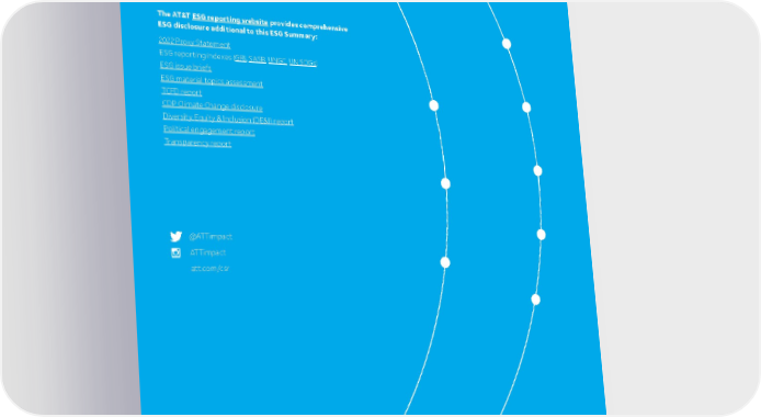 The AT&T ESG reporting website provides comprehensive ESG disclosure additional to this ESG Summary: 2022 Proxy Statement ESG reporting indexes ( GRI , SASB , UNGC , UN SDGs ) ESG issue briefs ESG material topics assessment TCFD report CDP Climate Change disclosure Diversity, Equity & Inclusion (DE&I) report Political engagement report Transparency report @ATTimpact ATTimpact att.com/csr