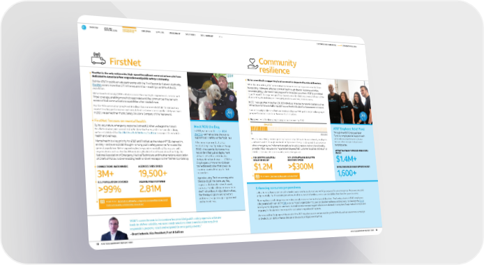 FirstNet is the only nationwide, high-speed broadband communications platform dedicated to America’s fi rst responders and public safety community. Built by AT&T in public-private partnership with the First Responder Network Authority, FirstNet covers more than 2.71 million square miles – reaching over 99% of the U.S. population. We’ve launched nearly 1,000 cell sites across the country to expand rural, remote and Tribal coverage, enabling more first responders and the communities they serve to access critical communications capabilities when needed most. For the 4th consecutive year, Frost & Sullivan has commended AT&T for innovation, market-leading performance and unmatched customer care in public safety solutions. In 2021, we earned their Public Safety Solutions Company of the Year award. FirstNet focuses on mental health By its very nature, emergency response is stressful. When we began the historic FirstNet initiative, we committed to Be There for America’s first responders. Now, we’ve established the FirstNet Health & Wellness Coalition to support their holistic health and wellness. Mental health is a key priority for AT&T and FirstNet, as the rates of PTSD, depression, anxiety – and even suicidal thought – among public safety personnel far exceed the general population. We’re supporting first responder mental health programs with organizations such as the Quell Foundation, Boulder Crest Foundation, Blue Help, the National Association of Emergency Medical Technicians and the International Association of Chiefs of Police. And we’re adding health and wellness apps to the FirstNet App Catalog. We’re committed to supporting local communities impacted by natural disasters. When disaster strikes, AT&T and employees demonstrate our corporate value Be There by assisting victims and affected communities through disaster response activities, corporate giving, volunteerism and support for impacted coworkers. AT&T is committed to working with strategic non-profit partners to provide solutions across all phases of the disaster lifecycle, including resiliency preparedness and long-term recovery. In 2021, we supported more than 200,000 individuals impacted by natural disasters such as Winter Storm Uri, historic California wildfires and the third-busiest hurricane season on record. Our community resilience efforts are motivated by our 2030 goal to help 1 million people prepare for and recover from the impacts of disasters. Progress: Help 1 million people prepare and recover by 2030 200,000 0 1,000,000 We also proactively monitor potential nature-related threats to our network, employees and communities through our Weather Operations Center. In the event of a disaster or other emergency, we implement procedures to quickly restore network functionality, provide critical resources to impacted employees, field customer inquiries and return or establish service in the communities where we operate. CUSTOMERS AND COMMUNITIES COMMUNITY RESLIENCE Read more: Community Engagement Issue Brief FirstNet Community resilience Read more: Business Continuity, Longevity & Innovation Issue Brief Network Quality & Reliability Issue Brief “AT&T’s commitment to innovation has provided public safety agencies with the tools to deliver reliable, mission-ready solutions that transform the way first responders prepare, react and respond to emergency events.” – Brent Iadarola, Vice President, Frost & Sullivan CONNECTIONS NATIONWIDE 3M+ Meet ROG the Dog In 2021, we launched FirstNet ROG the Dog - animal assisted therapy to support public safety on the front lines. Affectionately named after the FirstNet Response Operations Group (ROG) – the team led by former first responders that guides deployment of the FirstNet fleet of dedicated deployable network assets – ROG the Dog is a pack of more than 2 dozen trained labradoodles that specialize in animal assisted therapy for first responders. Agencies using FirstNet can request a therapy dog in the same way they request a deployable network asset, such as a mobile cell site or drone, from the FirstNet fleet. And just like the fleet, the therapy dogs are available at no additional charge to support personnel on the front lines. Enhancing consumer preparedness Unless families have experienced natural disasters in the past, most are not fully prepared for an emergency. These are stressful and potentially life-threatening situations. And for vulnerable families, a crisis can destabilize their lives for years to come. Planning ahead and being prepared makes people more resilient in the face of disasters. That’s why a team of AT&T employees collaborated with non-profit SBP , a social impact organization focused on disaster resilience and recovery, to develop the Equip app. By combining easy-to-use tools, shareable resources and expert advice consolidated in one place, Equip makes it simple and engaging for households to prepare for a disaster long before it happens. We released the Equip app at the onset of the 2021 disaster season and are working with SBP to launch an awareness campaign and video tutorials to enhance the use and capacity of Equip even further. AGENCIES SUBSCRIBED 19,500+ U.S. POPULATION COVERED >99% SQUARE MILES COVERED 2.81M OVERVIEW AT&T AND SHAREHOLDERS CUSTOMERS AND COMMUNITIES EMPLOYEES SUPPLIERS ENVIRONMENT GOVERNANCE GOALS SUMMARY AT&T Employee Relief Fund Through the AT&T Employee Relief Fund, our employees can support each other when natural disasters, house fires or other unexpected personal hardships arise. EMPLOYEE RELIEF FUND DISTRIBUTIONS IN 2021 $1.4M+ EMPLOYEES RECEIVING SUPPORT IN 2021 1,600+ 2021 AT&T FOUNDATION DISASTER RELIEF $1.2M 2021 AT&T NETWORK DISASTER RECOVERY SPEND >$300M KPI s AT&T ESG SUMMARY REPORT 2022 AT&T ESG SUMMARY REPORT 2022 18 19