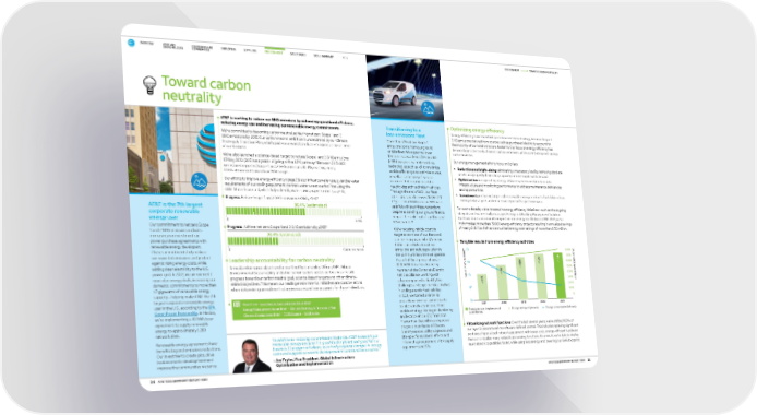 Transitioning to a low-emissions fleet More than 52% of our Scope 1 emissions come from our ground vehicle fleet. We expect to lower fleet emissions at least 75% by 2035 (2015 base year) by implementing technologies such as IoT to maximize vehicle efficiency and optimize routes, as well as customer self-service solutions that can minimize the need to dispatch technician vehicles. Through the end of 2021, our fleet emissions have decreased 182,975 MT CO 2 e – down 26% from our 2015 base year. We achieved these reductions despite expanding our ground fleet to support the build-out of our fiber and 5G networks. 23 We’re reducing vehicle count in targeted portions of our fleet and plan to incorporate hybrid/electric technician vehicles to cut our emissions and reduce pollution in the communities where we operate. As part of these preparations, in 2020 AT&T became a founding member of the Corporate Electric Vehicles Alliance, working with other companies to identify the challenges and opportunities involved in adding electric fleet vehicles. In 2021, we formed an internal cross-departmental committee to collaboratively advance our fleet vehicle strategy. We began developing an Electric Vehicle (EV) Transition Master Plan that will map expected progress over the next 10 years, identify needed utility upgrades and site-specific readiness efforts and inform the procurement of EV supply equipment and EVs. AT&T is the 7th largest corporate renewable energy user Our commitment to net zero Scope 1 and 2 GHG emissions includes increasing our investments in power purchase agreements with renewable energy developers. These commitments help reduce our reported emissions and protect against rising energy costs, while adding clean electricity to the U.S. power grid. In 2022, we announced 2 new solar energy deals, increasing our domestic commitments to more than 1.7 gigawatts of renewable energy capacity – helping make AT&T the 7th largest corporate renewable energy user in the U.S., according to the EPA Green Power Partnership . In Mexico, we’re implementing a 40 GWh/year agreement to supply renewable energy to approximately 1,200 network sites. Renewable energy agreements have benefits beyond emissions reductions. Our investments create jobs, drive local economic development and improve the communities we serve. ENVIRONMENT TOWARD CARBON NEUTRALITY AT&T is working to reduce our GHG emissions by enhancing operational efficiency, reducing energy use and increasing our renewable energy commitments. We’re committed to becoming carbon neutral, achieving net zero Scope 1 and 2 GHG emissions by 2035. Our carbon neutral ambition is underpinned by our Climate Strategy & Transition Plan, which guides our work to reduce emissions across all areas of our business. We’ve also launched a science-based target to reduce Scope 1 and 2 GHG emissions 63% by 2030 (2015 base year) – aligning with a 1.5°C pathway. 4 Between 2015–2021, we reduced reported Scope 1 and 2 GHG emissions 36.4%, reaching nearly 57.8% attainment toward our 2030 target. Our efforts to improve energy efficiency (page 35) also influence water use, given the water requirements of our cooling equipment. We track water use at our facilities using the AT&T Water Scorecard, which helps identify water-saving opportunities (page 36). Leadership accountability for carbon neutrality Annual performance objectives for our Chief Sustainability Officer, AVP – Global Environmental Sustainability and other senior leaders across our business include progress toward our carbon neutral goal, science-based targets and other climate- related objectives. This means our leading environmental initiatives are considerations when determining annual merit salary increases and bonus awards for these individuals. Optimizing energy efficiency Energy efficiency is an important part of our net zero strategy, because Scope 2 GHG emissions derived from sources such as purchased electricity account for the majority of our total emissions footprint. Our focus on energy efficiency has delivered consistent reductions in carbon emissions, while contributing cost savings to the business. Our energy management efforts focus on 3 pillars: • Reductions and right-sizing: eliminating unnecessary load by removing obsolete assets and properly diminishing capacity commensurate with demand • Optimization : incorporating energy-efficient systems and practices into infrastructure and monitoring performance to address maintenance deficiencies and opportunities • Investment : purchasing large-scale renewable energy contracts that deliver clean energy to local grids and reduce our reported Scope 2 emissions For over a decade, we’ve invested in energy efficiency initiatives – such as the ongoing integration of our centrally-managed Energy and Building Management Solution – that have made a measurable impact on our energy use. Between 2010-2021, we’ve implemented more than 151,000 energy efficiency projects resulting in annualized savings of nearly 8.1 billion kWh and annualized energy cost savings of more than $733 million. Toward carbon neutrality Read more: Greenhouse Gas Emissions Issue Brief Energy Management Issue Brief • Climate Strategy & Transition Plan Climate Change Issue Brief • TCFD Report • SASB Index “In addition to reducing our emissions footprint, AT&T is investing in renewable energy because it is good for the planet and good for our business. Our approach allows us to hedge against changes in energy costs and support economic development in communities we serve.” – J oe Taylor, Vice President, Global Infrastructure Optimization and Implementation Virtualizing network functions : Over the last several years, we’ve shifted 100% of our layer 3 core network to software-defined control. This includes replacing significant portions of specialized network equipment with lower-cost, energy-efficient hardware that can virtualize many network processin