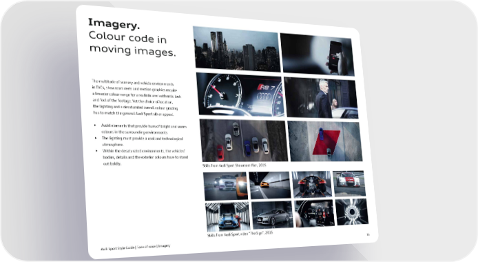 Imagery. Colour code in moving images. The multitude of scenery and vehicle environments in TVCs, showroom reels and motion graphics require a broader colour range for a realistic and authentic look and feel of the footage. Yet the choice of location, the lighting and a desaturated overall colour grading has to match the general Audi Sport silver appeal. • Avoid elements that provide hues of bright and warm colours in the surrounding environments • The lighting must provide a cool and technological atmosphere. • Within the desaturated environments, the vehicles’ bodies, details and the exterior colours have to stand out boldly. Stills from Audi Sport Showroom û lm, 2015 Stills from Audi Sport video
