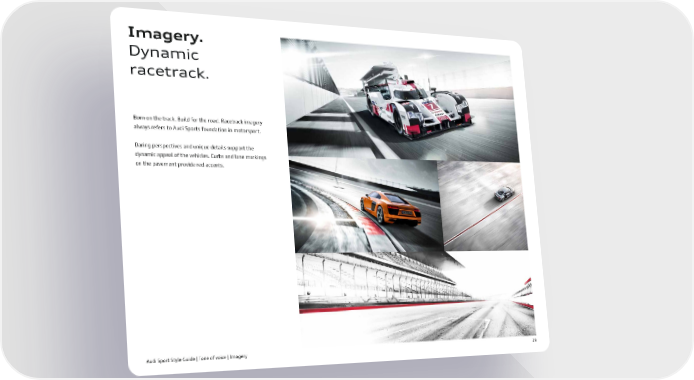 Imagery. Dynamic racetrack. Born on the track. Build for the road. Racetrack imagery always refers to Audi Sports foundation in motorsport. Daring perspectives and unique details support the dynamic appeal of the vehicles. Curbs and lane markings on the pavement provide red accents. Audi Sport Style Guide | Tone of voice | Imagery 29