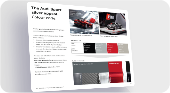 The Audi Sport BORN ON THE TRACK. BUILT FOR The all-new silver appeal. THE ROAD. Audi R8 Coupé. Colour code. Uptatqui debitati con nem renda consernatur seque eicium quatem voluptate laborep ellupta tianimi, qui reicilic tem venditio. The silver appeal is the main colour dominating images, Consernatur seque eicium. room settings and graphic elements. Colour code example – 2D communication Colour code example – spacial design The main diff erentiation to the general Audi CI colour code is as follows: • Amount of white is signiû cantly reduced Audi CI colour code • Amount of black is signiû cantly reduced. In spacial White Black Aluminium Silver Red Warm Silver design, dark glass fronts play with reü ections. 0/0/0/0 60/50/50/100 30/20/20/10 0/100/80/15 10/12/16/27 • Amount of Audi Red is increased. Audi Red sets strong - Pantone Black Pantone 877 Pantone 200 Pantone 401 accents by the integration of the red rhombus as well #ff ff ff #000000 #b3b3b3 #bb0a30 #b6b1a9 as signiû cant car details. 255/255/255 0/0/0 179/179/179 187/10/48 182/177/169 The colour code in Audi Sport communication follows a given ideal ratio: 60% Silver and metals: Genuine surfaces and materials Audi Sport colour code 25% Audi Red: Branding plus signiû cant details in imagery Audi Sport Aluminium Silver PANTONE® 8403 Audi Red PANTONE® 187 15% Audi Corporate Colours: Black, White Audi Sport Aluminium Silver is PANTONE® 8403 as a full-area special colour. faces faces Metallic sur Bright midtonesHigh glossy red High glossy white Carbon sur Audi Sport Style Guide | Tone of voice | Colour concept 22
