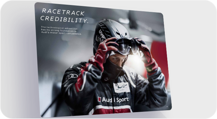 Audi Sport Brand Book Page 13 Page 15RACETRACK CREDIBILITY. The technological advantage has its strong foundation in Audi’s motor sport competence. 14
