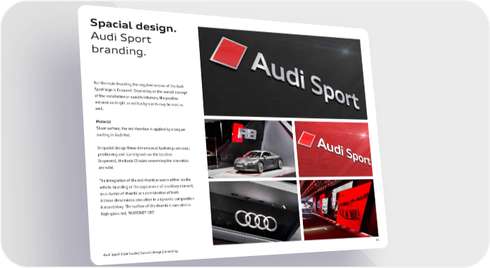 Spacial design. Audi Sport branding. For the main branding the negative version of the Audi Sport logo is favoured. Depending on the overall concept of the installation or speciû c interiors, the positive versions on bright or red backgrounds may be used as well. Material Silver surface, the red rhombus is applied by a lacquer coating in Audi Red. In spacial design three-dimensional Audi rings are used; positioning and size depends on the location. In general, the basic CI rules concerning the size ratios are valid. The integration of the red rhombus works either via the vehicle branding or the appearance of a solitary element, as a cluster of rhombi or a combination of both. A three-dimensional execution in a dynamic composition is mandatory. The surface of the rhombi is executed in high-gloss red, PANTONE® 187. Audi Sport Style Guide | Spacial design | Branding 43
