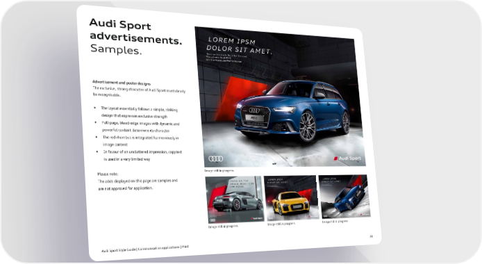 Audi Sport advertisements. Samples. Advertisement and poster designs The exclusive, strong character of Audi Sport must clearly be recognisable. • The layout essentially follows a simple, striking design that expresses exclusive strength • Full-page, bleed-edge images with dynamic and powerful content determine its character • The red rhombus is integrated harmoniously in image content • In favour of an uncluttered impression, copytext is used in a very limited way Please note: Image still in progress. The adds displayed on this page are samples and BORN ON THE TRACK. BUILT FOR The all-new are not approved for application. THE ROAD.Audi R8 Coupé. Quatem voluptate, qui reicilic tem venditio. Consernatur seque eicium. Image still in progress. Image still in progress. Image still in progress. Audi Sport Style Guide | Communication applications | Print 38