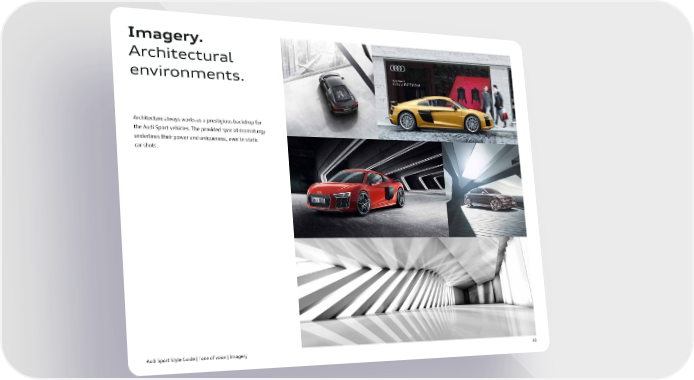 Imagery. Architectural environments. Architecture always works as a prestigious backdrop for the Audi Sport vehicles. The provided spacial dramaturgy underlines their power and uniqueness, even in static car shots. Audi Sport Style Guide | Tone of voice | Imagery 30