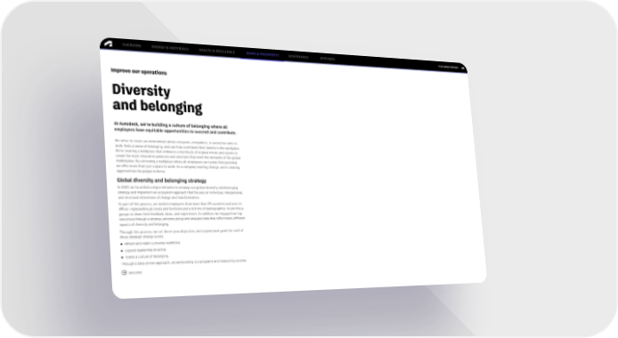 FY22 IMPACT REPORT OVERVIEW ENERGY & MATERIALS HEALTH & RESILIENCE WORK & PROSPERITY GOVERNANCE APPENDIX 48 Improve our operations Diversity and belonging At Autodesk, we’re building a culture of belonging where all employees have equitable opportunities to succeed and contribute. We strive to create an environment where everyone, everywhere, is excited to come to work, feels a sense of belonging, and can fully contribute their talents in the workplace. We’re creating a workplace that embraces a multitude of original minds and talents to create the most innovative products and solutions that meet the demands of the global marketplace. By cultivating a workplace where all employees can realize their potential, we offer more than just a place to work. As a company leading change, we’re creating opportunities for people to thrive. Global diversity and belonging strategy In 2020, we launched a major initiative to revamp our global diversity and belonging strategy and implement an ecosystem approach that focuses on individual, interpersonal, and structural dimensions of change and transformation. As part of this process, we invited employees from more than 25 countries and over 44 offices—representing all levels and functions and a rich mix of demographics—to join focus groups to share their feedback, ideas, and experiences. In addition, we engaged our top executives through a strategy advisory group and analyzed data that reflect many different aspects of diversity and belonging. Through this process, we set three-year objectives and aspirational goals for each of these strategic change levers: ● Attract and retain a diverse workforce ● Expand leadership diversity ● Foster a culture of belonging Through a data-driven approach, we are building our programs and measuring success. Learn more