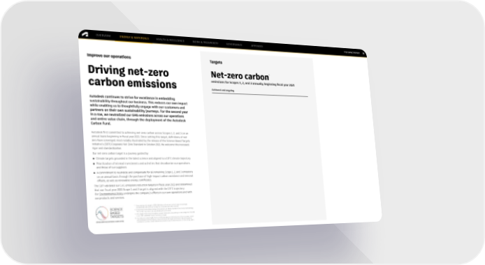 OVERVIEW ENERGY & MATERIALS HEALTH & RESILIENCE WORK & PROSPERITY GOVERNANCE APPENDIX FY22 IMPACT REPORT 11 Improve our operations Targets * Driving net-zero Net-zero carbon carbon emissions emissions for Scopes 1, 2, and 3 annually, beginning fiscal year 2021 Achieved and ongoing Autodesk continues to strive for excellence in embedding sustainability throughout our business. This reduces our own impact while enabling us to thoughtfully engage with our customers and partners on their own sustainability journeys. For the second year in a row, we neutralized our GHG emissions across our operations and entire value chain, through the deployment of the Autodesk Carbon Fund. Autodesk first committed to achieving net-zero carbon across Scopes 1, 2, and 3 on an annual basis beginning in fiscal year 2021. Since setting this target, definitions of net- zero have converged; most notably illustrated by the release of the Science Based Targets initiative’s (SBTi) Corporate Net-Zero Standard in October 2021. We welcome this increased rigor and standardization. Our net-zero carbon target is a journey guided by: ● Climate targets grounded in the latest science and aligned to a 1.5˚C climate trajectory ● Prioritization of internal investments and activities that decarbonize our operations and those of our suppliers ● A commitment to neutralize and compensate for all remaining Scope 1, 2, and 3 emissions on an annual basis through the purchase of high-impact carbon avoidance and removal offsets, as well as renewable energy certificates. The SBTi validated our GHG emissions reduction targets in fiscal year 2022 and determined that our fiscal year 2031 Scope 1 and 2 target is aligned with the 1.5˚C trajectory. Our Environmental Policy underpins the company’s efforts in our own operations and with our products and services. * Since setting this target in 2020, definitions of net-zero carbon have increasingly standardized. We continue to align our activities with best practice. † To estimate home office energy consumption, we follow the Work from Home methodology “No Survey” approach that was developed by Anthesis. ‡ This target covers all of Autodesk’s Scope 3 emissions, expanding on the categories included in our SBTi-validated Scope 3 emissions target. § This reduction was largely due to a 93% decrease in GHG emissions from business travel and employee commuting as a result of COVID-19 travel restrictions. We anticipate an increase in business travel-related and overall Scope 3 GHG emissions in the coming years.