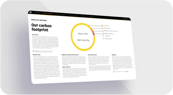 OVERVIEW ENERGY & MATERIALS HEALTH & RESILIENCE WORK & PROSPERITY GOVERNANCE APPENDIX FY22 IMPACT REPORT 13 Improve our operations 88% Procurement Our carbon 4% Business travel footprint 4% Employee commuting and remote work Total in FY22 2% Cloud and data centers 2% Workplaces Procurement We strive to embed sustainability into our purchasing practices, 0% Major conferences from our events and IT equipment to vendors and office supplies metric tons CO e such as paper. Since fiscal year 2021, we have partnered with CDP 2 to engage our suppliers and enhance collaboration and disclosure. During fiscal year 2022, we asked 89 of our top suppliers (by GHG emissions) to report information about climate-related programs and GHG emissions to CDP and had a 58% response rate. Through fiscal year 2022, 18 of our top suppliers (by GHG emissions) set science-based GHG emissions reduction targets. Learn more about our expanded Partner Code of Conduct and our programs with suppliers and business partners. Business travel Employee commuting and remote work Cloud and data centers Workplaces We seek to reduce business travel–related GHG emissions by To account for the impact of remote workers, in fiscal year 2022 Over the past three years, we have shifted more of our data We assess our facilities’ environmental operating practices promoting virtual/hybrid meetings, educating employees and (similar to fiscal year 2021) we included GHG emissions associated centers from Autodesk facilities to cloud infrastructure providers, related to energy use and other impact areas, and we work to partners, implementing a green rating system for hotels, and with home office energy consumption in our footprint (as a part increasing efficiency due to higher infrastructure capacity continuously review and make sustainability improvements. incorporating sustainability expectations into our standard of the employee commuting category based on the GHG Protocol) utilization. In addition, we strive to minimize data center energy We use our operations as test cases to help refine the functionality meeting contracts. To help advance sustainable air travel, during and purchased corresponding amounts of additional renewable use through server virtualization and selection of efficient of our solutions, improve our environmental performance, and 2021 we joined the United Airlines Eco-Skies Alliance, which 1,2 energy and carbon offsets. We plan to continue this practice equipment that meets respected industry standards and by showcase how customers can use our solutions to meet their supports the increased use of sustainable aviation fuel through moving forward. streamlining our code. sustainability objectives. Due to the pandemic and workplace member contributions. Employees have visibility into estimated Major conferences We source 100% renewable energy for our cloud services and data closures, emissions in this category were 37% lower in fiscal year GHG emissions for each flight segment purchased through our centers, and our cloud services have been carbon neutral since fiscal 2022 than in fiscal year 2020 (the year before the pandemic). online booking system, enabling more informed decisions about Autodesk University and One Team Conference (our annual channel year 2016. These efforts help us provide customers with a faster, Our offices have been powered by 100% renewable energy since air travel. We are also working to decarbonize our fleet using partner and sales summit) are both carbon neutral, including the 1 fiscal year 2016. hybrid and electric leased vehicles, and we are on target to convert events, attendee travel, and GHG emissions related to virtual more reliable experience with reduced environmental impacts. 3 at least 80% of our leased vehicles to hybrid or electric by the participation. We achieve this by enhancing efficiency, providing See detailed performance metrics in the Data summary. end of 2023. Emissions from business travel were 95% lower than virtual attendance options, reducing waste, and purchasing 1 in fiscal year 2020 (the year before the pandemic), largely due carbon offsets. In fiscal year 2022, all of our conferences were held 1 virtually due to COVID-19 travel restrictions. to COVID-19 travel restrictions.