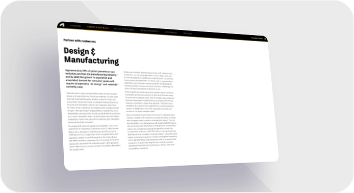 OVERVIEW ENERGY & MATERIALS HEALTH & RESILIENCE WORK & PROSPERITY GOVERNANCE APPENDIX FY22 IMPACT REPORT 18 Partner with customers Design & Manufacturing Approximately 19% of global greenhouse gas Energy use is another pressing issue, during both manufacturing 14 and product use. By using approaches such as digital twins and emissions are from the manufacturing industry, and by 2050 the growth in population and AI-assisted predictive maintenance, manufacturers can optimize associated demand for consumer goods will factory layout and operations. In sectors such as transportation, 15 16 automotive, and aerospace, designing lighter-weight products require at least twice the energy and materials utilizing generative design and other innovative technology can currently used. reduce energy consumption of products in use. These impacts and trends are driving manufacturers to commit to Materials use is a key environmental impact driver in product sustainable and circular outcomes in their work. In a new study design and manufacturing. Reducing materials use and waste focused on the European Union, 73% of manufacturing companies (through lightweighting and additive manufacturing) and surveyed understand sustainability as a component of formal using lower impact and more sustainable materials (such as 17 Manufacturing strategic vision from a leadership approach. recycled and renewable content) are important objectives companies that address these opportunities could see potential for many of our customers. Developing more circular product revenue of $338 billion from new sustainable products and designs—through design for upgradability, repairability, reuse, 18 services in the short to medium term. disassembly, and recycling—as well as transitioning to product- Based on internal research about the consumer packaged goods as-a-service and other more circular business models allows industry, nearly 6 in 10 consumers surveyed are willing to change companies to gain more value from materials and strengthen their shopping habits to reduce environmental impact. They are relationships with customers. also demanding more transparency, with close to half (49% saying To comply with materials regulations worldwide, such as the they do not have the information to verify products’ sustainability Restriction of Hazardous Substances (RoHS) Directive and claims. And companies recognize the benefits derived from Registration, Evaluation, Authorisation and Restriction of sustainability initiatives, with 77% of those surveyed agreeing Chemicals (REACH) regulation in the European Union and 19 Consumer goods that they drive an increase in consumer loyalty. legislation related to conflict minerals in the United States brands are looking for guidance on how to manage the complexity and other locations, companies face increasing pressure to of this transformation, and consumers need to be assured that assess and document the materials used in their products, companies are genuinely using the most innovative product and in some cases to ensure materials' traceability throughout designand manufacturing technology to achieve next-level the supply chain. sustainability innovation.