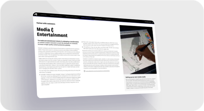FY22 IMPACT REPORT OVERVIEW ENERGY & MATERIALS HEALTH & RESILIENCE WORK & PROSPERITY GOVERNANCE APPENDIX 61 Partner with customers Media & Entertainment The media and entertainment industry is undergoing a transformation ● Flame on the cloud enables Flame artists to collaborate with one another from virtually as content creators innovate to meet the demands of a dramatic anywhere. Studios running Flame on the cloud can benefit from a scalable and secure increase in high-quality content production globally. work environment with a wide selection of compute and storage services. ● USD workflows in Maya, 3ds Max, Bifrost, and Arnold enable smoother data exchange Pandemic lockdowns and other measures forced studios to expand beyond the traditional both within studios and in the wider production supply chain. model of large teams based in centralized locations and embrace remote workflows. We are also investing in AI-assisted workflows for media and entertainment. Autodesk Utilizing cloud computing, prioritizing communication, and increasing security standards continues to invest in Flame’s machine learning toolset, helping artists automate complex to optimize collaboration across a global workforce has accelerated the transformation compositing and retouching tasks. By combining Flame's powerful AI-powered tools with of content creation. This new approach has enabled studios to hire diverse talent in new the massive compute power and scalability of the cloud, artists can work faster and focus places while reducing production costs. on the artistry of their craft. Supply chains for sourcing and creating content in the media and entertainment industry Autodesk is committed to empower anyone, anywhere, to create amazing entertainment are growing longer and more complex. Studios are desperate for talent, farming out parts and media experiences by providing tools that enable artists to deliver new levels of of the process at unprecedented rates while diversifying where they find qualified talent. creativity, collaboration, productivity, insight, and scale with production in the cloud. This has had a democratizing effect, improving access to opportunity beyond typical We are accelerating the industry’s transition to the future of production by disrupting concentrated media hubs. However, it has also added complexity to project management. traditional processes with new ways of working. Moving forward, we will continue Implementing cloud-based tools and hiring the right mix of talent both play a pivotal working to drive better collaboration through open standards, open project development role in managing decentralized talent creation. ecosystems, and interoperability of tools and platforms. Our tools help teams collaborate more effectively, increasing productivity and saving time Six Key Components to Successfully Navigating Your Remote Workflows and money. For example: ® ® ® ● Autodesk ShotGrid (formerly Autodesk Shotgun ) software streamlines workflows for creative studios by unifying production management, the creative process, and pipelines—in the cloud. ShotGrid enables producers to track and manage every aspect Setting up our own remote studio of their projects, supervisors to streamline the creative process and keep artists focused on the creative task at hand, and technical directors to build customized We’ve seen the pandemic change the way studios work and how artists collaborate pipelines that suit unique studio needs with plug-and-play integrations and an with one another. With remote work becoming the new normal, we decided open ecosystem. to put ourselves in the shoes of our customers by setting up a small remote studio to create a 3D sequence from concept through final render. The animated short, called “Mkali's Mission,” uses each of the tools in the Autodesk Media & Entertainment Collection—including Maya, 3ds Max, Arnold, and Autodesk® Mudbox® software—to showcase the breadth and power of the toolset.