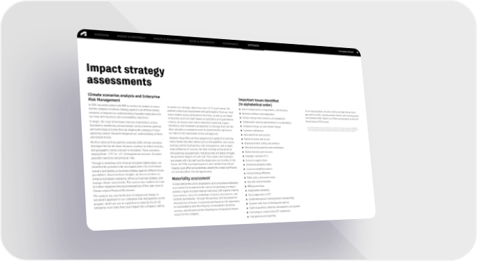 FY22 IMPACT REPORT OVERVIEW ENERGY & MATERIALS HEALTH & RESILIENCE WORK & PROSPERITY GOVERNANCE APPENDIX 72 Impact strategy assessments Climate scenarios analysis and Enterprise Important issues identified Risk Management (in alphabetical order) In 2021, Autodesk worked with BSR to conduct an analysis to stress- to realize our strategic objectives over a 3–5-year horizon. We ● Board compensation, independence, and diversity On an ongoing basis, we also continue to take into account test the company's business strategy against a set of three climate perform a biannual assessment with participation from our most ● Business resilience and adaptation geo-political risks, macroeconomic trends, and evolving policy scenarios, to improve our understanding of possible implications for senior leaders across all business functions, as well as our Board ● Climate change risk, resilience, and adaptation environments that impact our efforts and progress across the our long-term business and sustainability objectives. of Directors and CEO staff. Based on qualitative and quantitative ● Collaborative industry partnerships for sustainability broad range of ESG issues. To begin, the team interviewed internal stakeholders across criteria, we assess each risk to determine potential impact, likelihood, and Autodesk's preparation to manage that risk. We ● Company energy use and climate change * Our ESG reporting describes those topics which we consider to be the most important to stakeholders Autodesk to identify key environmental, social, economic, political, when evaluating environmental, social, and governance issues at Autodesk. Therefore, ESG materiality and technological trends that are shaping the company's future then calculate a cumulative score to determine the top four to ● Customer satisfaction in our reporting does not directly correspond to the concept of materiality used in securities law. operating context. Research deepened our understanding of these six risks for CEO and Board review and approval. ● Data protection and security and related trends. Detailed risk profiles are then prepared and updated for each top ● Digital inclusion and access We then tailored three publicly available 2030 climate scenarios risk to further describe criteria such as risk amplifiers, root causes, ● Employee health, safety, and wellness developed for the We Mean Business coalition to reflect industry existing control mechanisms, risk consequences, and a target ● Ethical business practices and compliance and geographic trends relevant to Autodesk. These scenarios— state definition of success. We then develop action plans to ● Global diversity and inclusion ranging from ~1.5°C to ~4°C of temperature increase—illustrate articulate key programmatic initiatives that will better mitigate plausible transition and physical risks. the potential impacts of each risk. These plans and strategies ● Improper use/sale of ICT Through a workshop with internal Autodesk stakeholders, we are shared with CEO staff and the Board every six months. In the ● Inclusive supply chains identified the potential risks and opportunities for each climate future, the ERM assessment process will consider how climate ● Intellectual property rights scenario and tested our business strategy against different future impacts could affect and potentially amplify the overall significance ● Local sustainability impacts possibilities. Based on those insights, we discussed ideas to of each identified risk and opportunity. ● Product energy efficiency enhance Autodesk’s resilience, refine our business strategy, and * ● Public policy and partnerships manage climate-related risks. This exercise has enabled our team Materiality assessment to further implement the recommendations of the Task Force on In 2020, before the COVID-19 pandemic, BSR conducted a materiality ● R&D and local innovation Climate-related Financial Disclosures. assessment for Autodesk in the context of updating our impact ● R&D partnerships This analysis has also facilitated a fundamental change in policies. Inputs included internal interviews with experts, internal ● Responsible marketing Autodesk’s approach to our Enterprise Risk Management (ERM) assessments, executive workshops, industry assessments, and ● Social application of ICT program, which we use as a platform to identify the 15–20 external benchmarks. Through this process, BSR developed an ● Sustainable product design/product stewardship enterprise-level risks that could impact the company’s ability extensive list of issues. It assessed each based on the importance to sustainability and the influence on Autodesk’s business ● Systemic risks from technology disruptions success, and determined the following list of important impact ● Talent acquisition, retention, development, and growth issues for the company. ● Technology in communities/ICT enablement ● Transparency and reporting