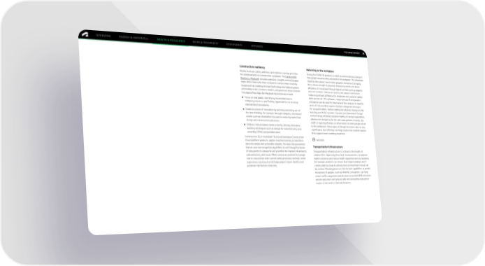 FY22 IMPACT REPORT OVERVIEW ENERGY & MATERIALS HEALTH & RESILIENCE WORK & PROSPERITY GOVERNANCE APPENDIX 31 Construction resiliency Returning to the workplace Worker and user safety, wellness, and resilience are key priorities During the COVID-19 pandemic, health recommendations changed for Autodesk and our construction customers. The Construction how people moved as they returned to the workplace. TheInfraWorks Resiliency Playbook includes examples, insights, and actionable Mobility Simulation tool models people’s movement, bringing steps about how to be more resilient in construction, covering data-driven insight to physical distancing needs and more issues such as creating stronger technology and data programs efficiency of movement through transit centers such as airports and making teams, business models, and processes more resilient. and rail stations. Indoor air quality and proper ventilation Futureproofing steps the Playbook recommends include: make a significant difference for employee and customer safety. ® ● Focus on standards, identifying inconsistencies in With Autodesk CFD software, computational fluid dynamics company practices and finding opportunities to develop simulation can be used for thermal and flow analysis to identify standardized procedures. areas of risk and then explore multiple mitigation strategies ● Create a culture of innovation by actively promoting out-of- for occupant safety—before making any physical changes to the the-box thinking, for example through company-sanctioned building and HVAC systems. Dynamo and Generative Design events such as a hackathon focused on reducing waste from in Revit bring informed decision making to design exploration, design and construction processes. whether for designing for the safe arrangement of desks, the width or spacing of aisles, or other needs. As more people return ● Embrace industrialized construction by utilizing innovative to the workplace, these types of design decisions take on new building techniques such as design for manufacturing and significance. Our offerings can help create more resilient spaces assembly (DfMA) and prefabrication. that support teams working anywhere. ® Construction IQ, in Autodesk Build and Autodesk Construction Cloud platform products, applies machine learning to transform Learn more data into simple and actionable insights. The daily risk assessment Transportation infrastructure feature uses text recognition algorithms to sort through hundreds of data points to categorize and prioritize the highest risk projects, Transportation infrastructure is critical to the health of subcontractors, and issues. When used as an assistant to manage communities. Improving these built environments can improve risk in conjunction with current safety processes and real-world health outcomes and reduce health disparities among residents; experience, Construction IQ helps project teams identify and for example, planners can ensure that major roadways aren’t prioritize risk factors every day. constructed too close to schools and communities more at risk for asthma. Planning processes that include capabilities to predict movement of people—such as Mobility Simulation—can help reduce traffic congestion (and decrease associated GHG emissions and air pollution) and ensure safe and accessible evacuation routes in the event of natural disasters.