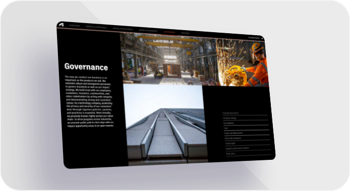 FY22 IMPACT REPORT OVERVIEW ENERGY & MATERIALS HEALTH & RESILIENCE WORK & PROSPERITY GOVERNANCE APPENDIX 66 Governance The way we conduct our business is as important as the products we sell. We maintain robust and transparent processes to govern Autodesk as well as our impact strategy. We build trust with our employees, customers, investors, communities, and other stakeholders by acting with integrity and demonstrating strong and consistent values. As a technology company, protecting the privacy and security of our customers’ data through rigorous policies, systems, and practices is essential. More broadly, Corporate governance we promote human rights across our value chain. To drive progress across industries, Company strategy we promote public policies that align withour Accountability impact opportunity areas in an open manner. Trust Privacy and data security Ethics and compliance Human rights Suppliers and business partners Public policy