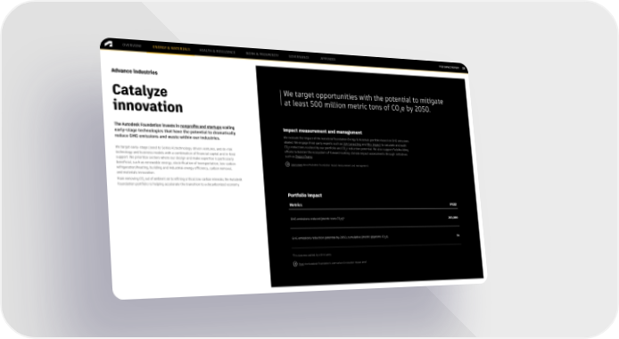 OVERVIEW ENERGY & MATERIALS HEALTH & RESILIENCE WORK & PROSPERITY GOVERNANCE APPENDIX FY22 IMPACT REPORT 23 Advance industries Catalyze We target opportunities with the potential to mitigate innovation at least 500 million metric tons of CO₂e by 2050. he Autodesk Foundation invests in nonprofits and startups scaling T Impact measurement and management early-stage technologies that have the potential to dramatically We evaluate the impact of the Autodesk Foundation Energy & Materials portfolio based on GHG emissions reduce GHG emissions and waste within our industries. abated. We engage third-party experts such as CEA Consulting and Rho Impact to calculate and audit C02e reductions realized by our portfolio and CO2e reduction potential. We also support field building We target early-stage (seed to Series A) technology-driven ventures, and de-risk efforts to bolster the ecosystem of forward-looking climate impact assessments through initiatives technology and business models with a combination of financial capital and in-kind such as Project Frame. support. We prioritize sectors where our design and make expertise is particularly beneficial, such as renewable energy, electrification of transportation, low-carbon Learn more about Autodesk Foundation impact measurement and management. refrigeration/heating, building and industrial energy efficiency, carbon removal, and materials innovation. From removing CO out of ambient air to refining critical, low-carbon minerals, the Autodesk 2 Foundation portfolio is helping accelerate the transition to a decarbonized economy. Portfolio impact Metrics FY22 GHG emissions reduced (metric tons CO2e)* 203,000 GHG emissions reduction potential by 2050, cumulative (metric gigatons CO2e) 14 *This data was audited by a third party. Read the Autodesk Foundation’s Low-carbon Innovation impact brief.