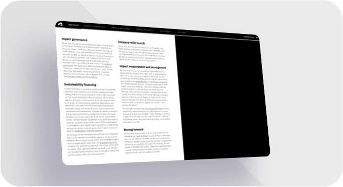 FY22 IMPACT REPORT OVERVIEW ENERGY & MATERIALS HEALTH & RESILIENCE WORK & PROSPERITY GOVERNANCE APPENDIX 08 Impact governance Company-wide launch We are operationalizing and integrating our impact strategy across During 2021, we introduced employees across Autodesk to our our business. This begins with deepening and expanding how impact strategy, reinforcing our company vision of a better world we govern impact. Our Board of Directors provides oversight of designed and made for all, strengthening our culture of impact, environmental, social, and governance (ESG) issues overall at and inspiring employees to play a role in realizing our strategy. Autodesk. In 2022, our Board of Directors Corporate Governance By aligning, inspiring, and activating Autodesk employees to bring and Nominating Committee and Compensation and Human impact into their work, we can accelerate progress. Resources Committee began assisting the Board with such oversight in the areas defined in their charters. See Corporate Impact measurement and management governance. Also beginning in 2022, Autodesk’s ESG Steering Committee—composed of leaders from Finance, Legal, Human For more than 10 years, we have publicly reported metrics that Resources, and Impact—convenes quarterly to review and demonstrate our progress and impact, such as greenhouse gas prioritize issues relevant to the company’s ESG strategy. (GHG) emissions, energy use, employee demographics, and See Company strategy and Accountability. philanthropic investments. We have set and made progress against goals related to our carbon footprint and diversity and belonging. Sustainability financing As a software company, however, our biggest opportunity to create impact at scale is by enabling our customers to harness data and To drive investments in innovative projects to advance sustainable generate insights to improve design and make decisions. outcomes in our industries, we are further aligning our impact Although these activities are complex, multidimensional, and strategy with our financial strategy. In October 2021, we issued outside of our direct control, we know that making and managing our first sustainability bond offering totaling $1 billion. We are progress in these areas, and helping customers do the same, applying proceeds to fund projects in a broad range of areas, requires measurement. We are working to develop meaningful such as eco-efficient products, production technologies, and metrics to push our business, support our customers, and processes; sustainable water and wastewater management; advance the industry. renewable energy and energy efficiency; and socioeconomic The Autodesk Foundation has gained important insights into the advancement and empowerment. To expand the benefits associated complexity of opportunities presented by impact measurement. with processing the offering, we brought in three diverse banks— As we advance and scale Autodesk’s impact strategy, we continue including one veteran-owned, one Black-owned, and one Black to apply these learnings to better enable customers to measure woman–owned/managed—as partners in our bond deal working and manage impact—and drive collective progress in our markets alongside top multinational banks. Later in 2022, we will publish and industries overall. a Sustainability Bond Impact Report, describing use of proceeds and expected and/or realized impacts, when feasible. Learn more Moving forward about our Sustainability Financing Framework. During 2021, we also refinanced an Autodesk line of credit and We have only begun to capitalize on the broad potential of tied it to our corporate sustainability targets of reducing carbon integrating our impact strategy into our business. In the coming emissions and increasing women in tech. If we meet those targets, years, we will continue expanding our governance frameworks, we are charged slightly lower rates. The Autodesk Carbon Fund refining our operating model, improving metrics and management, is another key aspect of our approach. Through an internal price and driving accountability throughout the company. This will on carbon, which capitalizes the Fund, we invest in our efficiency enable us to better meet growing stakeholder expectations and and decarbonization targets as well as renewable energy and manage rapidly evolving risks while unlocking tremendous certified carbon offset and removal projects. opportunities for Autodesk and our customers.