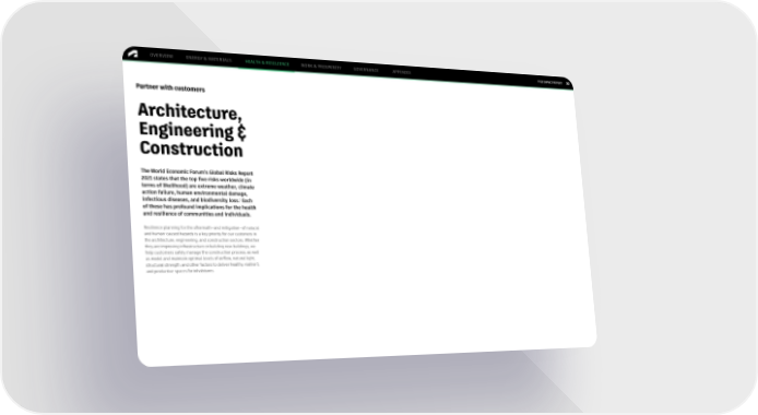 FY22 IMPACT REPORT OVERVIEW ENERGY & MATERIALS HEALTH & RESILIENCE WORK & PROSPERITY GOVERNANCE APPENDIX 30 Partner with customers Architecture, Engineering & Construction The World Economic Forum’s Global Risks Report 2021 states that the top five risks worldwide (in terms of likelihood) are extreme weather, climate action failure, human environmental damage, 1 infectious diseases, and biodiversity loss. Each of these has profound implications for the health and resilience of communities and individuals. Resilience planning for the aftermath—and mitigation—of natural and human-caused hazards is a key priority for our customers in the architecture, engineering, and construction sectors. Whether they are improving infrastructure or building new buildings, we help customers safely manage the construction process, as well as model and maintain optimal levels of airflow, natural light, structural strength, and other factors to deliver healthy, resilient, and productive spaces for inhabitants.