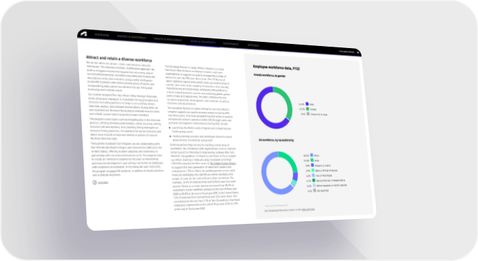 FY22 IMPACT REPORT OVERVIEW ENERGY & MATERIALS HEALTH & RESILIENCE WORK & PROSPERITY GOVERNANCE APPENDIX 50 Attract and retain a diverse workforce Employee workforce data, FY22* We all win when we attract, retain, and advance talented The Autodesk Women in Sales (AWiS) initiative is a cross- individuals. This requires a holistic, multifaceted approach. We functional effort between our human resources and sales Overall workforce, by gender work to integrate inclusive hiring practices into every step of organizations in support our goal to increase the number of our recruitment process, including evaluating and revising job women in sales by 25% over three years. The US Bureau of descriptions to be more inclusive, using market intelligence Labor Statistics reports that women hold just under a third of to identify locations with strong diverse pools of talent, and outside sales roles in the majority of industries, most notably incorporating early career recruitment into our hiring plan manufacturing and technology. Addressing this problem is to develop and cultivate talent. critical to both business success and achieving global gender Our custom-designed five-day virtual Hiring Manager Bootcamp parity in pay and opportunity. The AWiS initiative focuses trains all people managers in Autodesk’s hiring principles and on talent acquisition, development, and retention, as well as 64.9% Male inclusive recruiting practices to help us successfully attract, inclusive cultural practices. 35.0% Female interview, assess, and onboard diverse talent. During 2021, we The Autodesk Women in Digital Enterprise Services (WDES) also launched our Recruiter Bootcamp to onboard new recruiters initiative supports our goal to increase women in tech by 25% 0.1% Choose not to state and refresh current talent acquisition team members. over three years. It includes programming that works to equalize The program covers topics such as mitigating bias in the interview and promote women’s presence within DES through career and process, utilizing diversity partnerships, talent sourcing, writing personal development. Achievements during 2021 include: inclusive job descriptions, and coaching hiring managers on ● Launching the WDES Guilds Program and completing two inclusive hiring practices. All searches for senior directors and Guilds group cycles above must include at least one woman or person of color on ● Hosting training sessions and workshops related to career the final interview slate. advancement, mentorship, and growth US workforce, by race/ethnicity Through the Autodesk Tech Program, we are collaborating with External partnerships are key to reaching a wide array of four Historically Black Colleges and Universities (HBCUs) in the candidates. We collaborate with organizations such as National United States, offering student stipends and mentoring in Action Council for Minorities in Engineering, Lesbians Who Tech, partnership with our technical business units. The program aims AfroTech, Fairygodboss, Techqueria, and Power to Fly to support 62.6% White to create an immersive experience focused on mentorship, our effort. Starting in February 2022, Autodesk committed 24.6% Asian professional development, and solving real technical challenges $150,000 annually for three years to The Hidden Genius Project with engineers at Autodesk. In its inaugural year 2020/2021, to support the next generation of Black tech leaders and 7.0% Hispanic or Latino the program engaged 20 students, in addition to faculty advisors entrepreneurs. These efforts are yielding positive results, with 2.9% Black or African American and Autodesk engineers. more job candidates who identify as women (globally) and people of color (in the United States) than ever before. For 2.3% Two or More Races Learn more example, 39.9% of external hires during fiscal year 2022 were 0.3% Native American or Alaska Native women. Partly as a result, women increased from 33.4% of 0.2% Native Hawaiian or Pacific Islander Autodesk’s overall workforce globally at the end of fiscal year 2020 to 35.0% at the end of fiscal year 2022. In the United States, 0.1% Not specified 7.9% of external hires during fiscal year 2022 were Black. This contributed to the rise from 1.7% of the US workforce that Black employees represented at the end of fiscal year 2020 to 2.9% at the end of fiscal year 2022. * Data are as of the end of fiscal year 2022. See detailed performance metrics in the Data summary.
