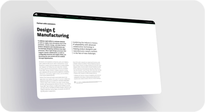 FY22 IMPACT REPORT OVERVIEW ENERGY & MATERIALS HEALTH & RESILIENCE WORK & PROSPERITY GOVERNANCE APPENDIX 34 Partner with customers Design & Manufacturing To address rapid shifts in customer demand Combining the industry’s history as well as supply chain disruptions due to the of adaptability with advanced pandemic, climate change, and other factors, collaboration technology is product designers and manufacturers are helping product designers and increasingly designing resilience into their manufacturers remain resilient processes. More rapid design processes that support remote collaboration, as well as in the face of new challenges. configurable factories and supply chains, are becoming the new normal and are enabled through digitalization. Shutdowns and slowdowns at factories, ports, and shipping Around the world, companies are reopening for business under yards combined with massive shifts in demand have caused a dramatic change of conditions. Physical distancing measures disruption to supply chains and abrupt price increases globally, have created a need for reconfigured production lines that ensure and companies are finding they must adapt their strategies employee safety. Factories require increased flexibility to quickly to reduce risk and ensure production continuity. Autodesk® shift to respond to evolving product demands. Digital factory ® ® Fusion 360 Manage software is helping companies manage tools like Autodesk Factory Design Utilities help teams redesign and collaborate with new and existing suppliers by centralizing layouts, incorporate new safety elements, evaluate the impact information, automating supplier reviews, and streamlining on productivity, and plan an efficient implementation. a secure procurement process. Combining the industry’s history of adaptability with advanced Working from home and hybrid work models require new collaboration technology is helping product designers and approaches that replicate the type of in-person collaboration manufacturers remain resilient in the face of new challenges. engineering teams are accustomed to. Autodesk collaboration software helps teams securely access data, conduct design See a summary of Autodesk Design & Manufacturing solutions that enable reviews, and stay productive wherever they are. Cloud-hosted sustainable design. ® Fusion 360 Team software is enabling team members to access and share data by centralizing all design changes, comments, and markups made from various teams, so everyone can easily see how the project is progressing.
