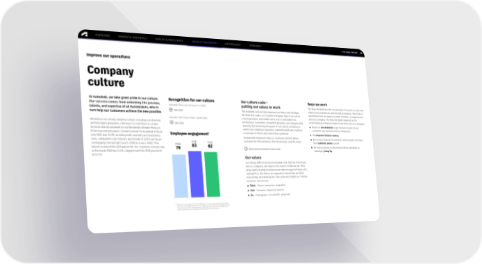 FY22 IMPACT REPORT OVERVIEW ENERGY & MATERIALS HEALTH & RESILIENCE WORK & PROSPERITY GOVERNANCE APPENDIX 41 Improve our operations Company culture At Autodesk, we take great pride in our culture. Recognition for our culture Our culture code— Ways we work Our success comes from unlocking the passion, Newsweek “Most Loved Workplace” list (2021) putting our values to work The Ways We Work describe the principles that guide our decision talents, and expertise of all Autodeskers, who in Learn more The Autodesk Culture Code expresses our Values and the Ways making and underlay our policies and procedures. They help us turn help our customers achieve the new possible. We Work that make us a Customer Company. It puts our culture understand how we operate as team members, as departments, Glassdoor “Best Places to Work” list #21 (2022) into meaningful, actionable terms and is embedded into and as a company. The Ways We Work help build a rich We believe our strong company culture, including our diversity performance evaluations, recognition programs, and company-wide understanding of what we expect of ourselves and our colleagues. and belonging programs, continues to contribute to a lower Learn more learning. By harnessing the power of our culture, we deliver a ● We act as one Autodesk to get the best results for our turnover rate as compared to our Worldwide Software Products world-class employee experience, partnering with and enabling customers, our business, and our employees. & Services industry peers. Overall turnover for Autodesk in fiscal * our people to thrive and realize their potential. ● We empower decision makers. year 2022 was 14.0%, including both voluntary and involuntary Employee engagement exits, compared to an industry benchmark of 19.5% during an Empowered employees help our customers achieve better ● We actively foster an environment where people can bring overlapping time period (June 1, 2020 to June 1, 2021). This FY21 FY22 outcomes for their products, their businesses, and the world. their authentic selves to work. FY20 83 82 placed us around the 25th percentile. Our voluntary turnover rate 79 Behind Scenes of Autodesk’s Culture Code ● We hold ourselves to the highest ethical standards by in fiscal year 2022 was 11.1%, compared with the 50th percentile embodying integrity. 1 of 13.7%. Our values Our Values define how we at Autodesk work, both as individuals and as a company, and express the essence of who we are. They bring clarity to what we believe and what we expect of those who work with us. Our Values are organized around how we think, how we feel, and what we do. They guide and inspire our choices, mindsets, and actions. ● Think – Smart, innovative, adaptable ● Feel – Inclusive, impactful, humble ● Do – Courageous, accountable, pragmatic * Represents the average employee engagement score over three pulses during a given fiscal year. The engagement score is on a scale of 1–100 measuring the average outcome of two questions, eSat and Recommend. These data are reported on a calendar year basis. Fiscal year 2022 corresponds to calendar year 2021, and so forth.