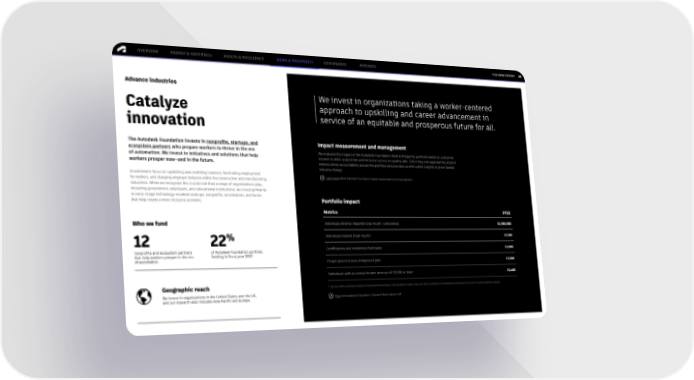 FY22 IMPACT REPORT OVERVIEW ENERGY & MATERIALS HEALTH & RESILIENCE WORK & PROSPERITY GOVERNANCE APPENDIX 62 Advance industries We invest in organizations taking a worker-centered Catalyze approach to upskilling and career advancement in innovation service of an equitable and prosperous future for all. The Autodesk Foundation invests in nonprofits, startups, and Impact measurement and management ecosystem partners who prepare workers to thrive in the era We evaluate the impact of the Autodesk Foundation Work & Prosperity portfolio based on outcomes of automation. We invest in initiatives and solutions that help related to skills acquisition and inclusive access to quality jobs. Collecting and aggregating aligned workers prosper now—and in the future. metrics drives accountability across the portfolio and provides us with useful insights to drive toward industry change. Investments focus on upskilling and reskilling learners, facilitating employment Learn more about Autodesk Foundation impact measurement and management. for workers, and changing employer behavior within the construction and manufacturing industries. While we recognize the crucial role that a range of organizations play, including government, employers, and educational institutions, we invest primarily in early-stage technology-enabled startups, nonprofits, accelerators, and funds that help create a more inclusive economy. Portfolio impact Metrics FY22 * Who we fund Individuals directly impacted (low-touch, cumulative) 12,100,000 * 12 22% Individuals trained (high-touch) 17,500 nonprofits and ecosystem partners of Autodesk Foundation portfolio Certifications and credentials facilitated 13,800 that help workers prosper in the era funding in fiscal year 2022 of automation People placed in new or improved jobs 13,500 Individuals with an annual income increase of $5,000 or more 13,400 Geographic reach * Low-touch refers to individuals impacted through educational technology or learning platform solutions. High-touch refers to individuals who received formal training, either on the job or through job placement programs. We invest in organizations in the United States and the UK, Read the Autodesk Foundation’s Future of Work impact brief. and our research also includes Asia Pacific and Europe.