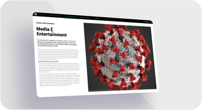 FY22 IMPACT REPORT OVERVIEW ENERGY & MATERIALS HEALTH & RESILIENCE WORK & PROSPERITY GOVERNANCE APPENDIX 36 Partner with customers Media & Entertainment By unlocking the capabilities of powerful content creation and production management tools, and bringing them to the cloud, we are paving the path for a more efficient, resilient, and scalable entertainment production future. Digital tools in the Autodesk cloud build resilience into the media and entertainment industry by enabling remote collaboration and simplifying customer workflows. Media and entertainment companies are becoming more flexible than ever, with a growing global remote workforce, cloud-based business models that embrace agility and cost-efficiency, and innovative tools that foster creativity and enable secure and safe information exchange inside and across studios. We support open source standards, which provide an important foundation for these efforts. Medical illustration and visualization 3ds Max and Maya software are used in the medical field to create accurate and realistic visualizations of complex physiological processes and medical procedures through both high-quality video and VR experiences. This content can be used to train doctors, nurses, and other healthcare professionals to support high-quality healthcare delivery. It can also educate patients about the intricacies of the human body and the possible benefits of medical interventions. The medical illustration team at the Centers for Disease Control (CDC) routinely collaborates with researchers and scientists to develop compelling 3D imagery, animated videos, and motion graphics that convey health risks such as parasites, bacteria, viruses, and more. The team leans on a range of 3D content creation applications, including Autodesk 3ds Max tools for modeling, animation, and VFX and Arnold technology for rendering. In designing the iconic COVID-19 coronavirus image, they used 3ds Max software to make a precise, high-contrast image with strong details and textures to best help the public visualize and understand the invisible threat. Image Courtesy of Alissa Eckert, MSMI; Dan Higgins, MAMS
