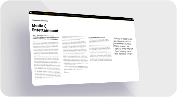 OVERVIEW ENERGY & MATERIALS HEALTH & RESILIENCE WORK & PROSPERITY GOVERNANCE APPENDIX FY22 IMPACT REPORT 21 Partner with customers Media & Entertainment With a tremendous increase in content Replacing energy-intensive workstations with lighter footprint Moving film production to the cloud Shifting to cloud-based consumption globally, the media and entertainment local devices and moving to fully virtualized cloud-based Movie Labs is a consortium founded by major Hollywood industry is experiencing a content creation boom. workflows can also reduce energy consumption. studios that aims to effect transformational change in the solutions can reduce In some cases, media and entertainment companies are also industry by creating new dynamic creative processes Traditional services, streaming services, and rapidly evolving replacing physical sets with virtual sets displayed on large LED enabled by cloud architecture. GHG emissions, since areas such as the metaverse have undergone explosive growth screens behind live actors, which can reduce materials use and and convergence, further increasing demand. While this creates waste while saving time and money. Autodesk helps make this Movie Labs has urged industry leadership to invest in production those services are opportunities for individuals and studios worldwide, it also possible with Unreal Live Link for Maya. While 3D artists model technology for the future of media creation. This aligns with challenges companies, including Autodesk, to innovate ways and animate in Maya, the data flows into Unreal Engine in real our vision to build a more resilient future by transitioning to typically more efficient to meet this demand efficiently and securely while helping time, allowing filmmakers to see actors on set in the context of cloud-based workflows and business models, and we are customers consider environmental impact. Autodesk helps CG assets and iterate on changes live and in the moment. In other proud to collaborate with this industry think tank. than company-owned by enabling cloud-based rendering, supporting virtualized industries, use of virtual product prototypes, which are photoreal To this end, in January 2022 Autodesk acquired Moxion, a New workflows, and advancing relevant third-party standards 3D renders of product models, can offer similar benefits. Zealand–based developer of camera to cloud (C2C) workflows and managed servers. and principles. Large productions such as films, episodic content, and games often for live action film sets, expanding our own cloud platform for Media and entertainment companies often have thousands or depend on the collaboration of many studios. This can involve Media & Entertainment upstream to include on-set production tens of thousands of servers for simulation, rendering, and multiple versions of animated characters, visual effects, and other workflows. Moving beyond post-production, this technology other virtualization tasks, and this trend is accelerating. Many digital assets, which increases the use of IT equipment and will bring new users to Autodesk while helping better integrate studios large and small are shifting to the cloud, which energy. Autodesk is working with the Academy Software Foundation real-time workflows across the entire content production chain. supports remote collaboration and reduces the need for on-site on open source standards to decrease the need for multiple IT infrastructure while also decreasing GHG emissions, since versions of digital assets, as well as simplifying customer workflows those services are typically more energy efficient than company- in-studio and between studios. owned and managed servers. Through partnerships with cloud To advance progress toward a more sustainable cloud, we are a service providers, artists can use tools such as Arnold global signatory to The Corporate Colocation and Cloud Buyers’ Principles, ® ® a project of the Future of Internet Power Collaborative Initiative. illumination renderer and Autodesk Flame 3D compositing, VFX, and finishing software on premises or in the cloud. With our virtualization policy and cloud rights that come with the Learn more ® software, customers can also bring solutions such as Autodesk ® ® 3ds Max , Maya , Arnold, and Flame software to the cloud and purchase compute time (including through our carbon neutral cloud services).