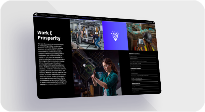 FY22 IMPACT REPORT OVERVIEW ENERGY & MATERIALS HEALTH & RESILIENCE WORK & PROSPERITY GOVERNANCE APPENDIX 40 Work & Prosperity The rate of change in our global economy is accelerating, and the workforce of tomorrow won’t look the same as today. Autodesk is at the forefront of this transformation, and we believe that Improve our operations automation technology, including artificial Company culture intelligence and machine learning, is needed to help meet the demands of a Flexible workplace growing and urbanizing global population. Learning and organization development We recognize that technological change drives disruption, and Autodesk is Employee impact at work committed to helping workers adapt and Diversity and belonging thrive. We believe employees prosper by adopting a mindset of continuous learning, Partner with customers acquiring the most in-demand skills, and Education securing the most fulfilling roles. We also believe employers and industries succeed Industry trends when they recruit, retain, and promote a Architecture, Engineering & Construction diverse and inclusive workforce. We’re putting people at the center of the future Design & Manufacturing of work transformation by investing in our Media & Entertainment employees, customers, and communities. Advance industries Catalyze innovation Accelerate collaboration Shape policies