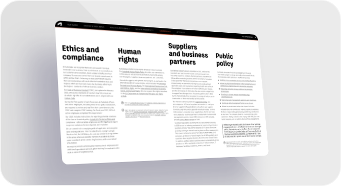 FY22 IMPACT REPORT OVERVIEW ENERGY & MATERIALS HEALTH & RESILIENCE WORK & PROSPERITY GOVERNANCE APPENDIX 70 Suppliers Ethics and Human and business Public compliance rights partners policy At Autodesk, we recognize that every group and individual Autodesk promotes human rights wherever it does business. Our Partner Code of Conduct, expanded in 2022, outlines the Autodesk advocates for public policies around the world involved in our business, from our investors to our resellers to The Autodesk Human Rights Policy describes our commitments standards and practices we require our business partners, that enable people to design and make a better world for all. our customers and coworkers, holds a stake in the future of our in this area, as well as how we promote human rights among including suppliers, vendors, channel partners, and others to We champion public policies in the following areas: company. Our success comes from our shared commitment to our employees, suppliers, business partners, and customers. follow while conducting business with or on behalf of Autodesk. ● Enabling more sustainable construction and manufacturing acting as One Team. Delivering on that commitment requires Autodesk supports and upholds human rights as outlined in the It also specifies that business partners must support ● Advancing digital transformation in the manufacturing and that our relationships with each other be founded on trust and International Bill of Human Rights, which includes the Universal internationally recognized human rights and comply with all architecture, engineering, and construction industries respect, which we must earn every day by always adhering to Declaration of Human Rights, the International Covenant on Civil applicable laws and regulations regarding health and safety in the highest standards of ethical business conduct. and Political Rights, and the International Covenant on Economic, the workplace, the eradication of human trafficking and slavery, ● Protecting consumer privacy and fostering emerging Our Code of Business Conduct (COBC), last updated in February Social, and Cultural Rights. We also support the rights described and the elimination of child labor. We also require our partners technologies 2022, articulates standards of conduct meant to ensure we in the ILO Declaration on Fundamental Principles and Rights to support fair labor practices. If business partners don't abide ● Investing in climate change–resilient buildings do what’s right for all our stakeholders and is aligned with our at Work. by the Partner Code, they are subject to a range of actions, up to and infrastructure Culture Code. termination of their relationship with Autodesk. ● Improving water management, resiliency, and cleanliness During the first quarter of each fiscal year, all Autodesk officers View our Conflict Minerals Policy and Autodesk Limited’s Statement on The Partner Code also promotes supplier diversity, and ● Scaling up skills development for the future of work and active employees, including those of our global subsidiaries, Countering Slavery and Human Trafficking. encourages our US-based suppliers and vendors to certify as are required to review and reaffirm their commitment to the diverse suppliers (if applicable), develop their own supplier ● Advancing equal opportunity, diversity, and inclusion COBC and complete COBC training. For fiscal year 2022, 100% of Learn more about our approach and performance in areas related to human diversity programs, and support diverse businesses. To drive Autodesk does not contribute to individual political candidates. 1 rights such as diversity and belonging, employee health and safety, and GHG emissions reduction in our supplier base, the Partner Code We have a longstanding global policy prohibiting contributions active employees completed this requirement. privacy and data security. Autodesk Foundation also supports human rights Our COBC includes instructions for reporting potential violations through investments that drive progress related to Energy & Materials, encourages our business partners to implement environmental at any level. The company does not have a political action Health & Resilience, and Work & Prosperity. management systems, report GHG emissions to CDP annually, committee. Rarely, Autodesk may engage with 501(c)4s or on of the law or Autodesk policy. Autodesk’s Business Ethics and and set science-based targets by 2026. ballot measures, and we publicly disclose those engagements. Compliance Hotline enables employees and third parties to report suspected violations for investigation and resolution. To embed responsible sourcing into our procurement process, We are committed to complying with all applicable anticorruption in 2022 we are introducing environmental, social, and governance Reflecting enhanced public disclosure of our political laws and regulations. This includes the US Foreign Corrupt questions into our request for proposal (RFP) process and are engagement and a new Board of Directors oversight Practices Act, the UK Bribery Act, and any similar local regulations providing training to relevant sourcing teams on these requirements. policy, Autodesk rose to the First Tier of companies This covers information about fair labor, human rights, GHG in the 2021 CPA-Zicklin Index of Corporate Political in the areas where we operate. Partners must abide by these emissions, and science-based targets for all RFPs globally, and Disclosure and Accountability. Our score of 85.7 (out same standards while conducting business with or on behalf questions about supplier diversity for RFPs in the United States. of 100) was 38.3 points above the IT sector average. of Autodesk. In addition, we have added questions about sustainable business We require periodic anticorruption training for all employees and practices to RFPs worldwide related to IT infrastructure, IT Learn more about our public policy efforts, political contrib