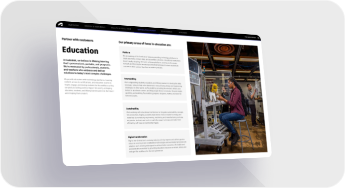 FY22 IMPACT REPORT OVERVIEW ENERGY & MATERIALS HEALTH & RESILIENCE WORK & PROSPERITY GOVERNANCE APPENDIX 54 Partner with customers Our primary areas of focus in education are: Education Platform We are working at the forefront of industry providing technology platforms to create solutions, connect data, and accelerate outcomes. Educational institutions At Autodesk, we believe in lifelong learning benefit by by adopting the same software platforms used by professionals that’s personalized, portable, and pragmatic. to teach and develop the knowledge and skills necessary for their students to We’re motivated by professionals, students, succeed in their careers. Together we make it possible. and teachers who embrace and deliver solutions to today’s most complex challenges. We provide educators with technology platforms, learning Futureskilling content, access to certifications, and education events to We’re empowering students, educators, and lifelong learners to develop the skills inspire, engage, and develop students for the workforce so they necessary today to help solve tomorrow’s most pressing design and engineering can produce lasting positive impact. We aren't just helping challenges. In other words, we futureskill by providing the mindset, skillset, and educators, students, and lifelong learners peer into the future– toolset to accelerate careers and help people thrive in industry. Beyond simple we're helping them create it. upskilling and reskilling, futureskilling prepares designers, makers, and doers for tomorrow’s jobs. Sustainability We’re working with educational institutions to integrate sustainability concepts into instruction, helping students make better choices related to energy and materials. By revitalizing engineering, machining, and manufacturing curricula, we provide students and teachers with the power to design and make more efficiently, with less environmental impact. Digital transformation Digital transformation is evolving industry to help improve and deliver greater value. As new cloud and collaborative technologies and automated processes are adopted, work is being redesigned to achieve better outcomes. We enable and accelerate this transition by providing education resources to retrain, retool, and reshape the workforce for the next generation.