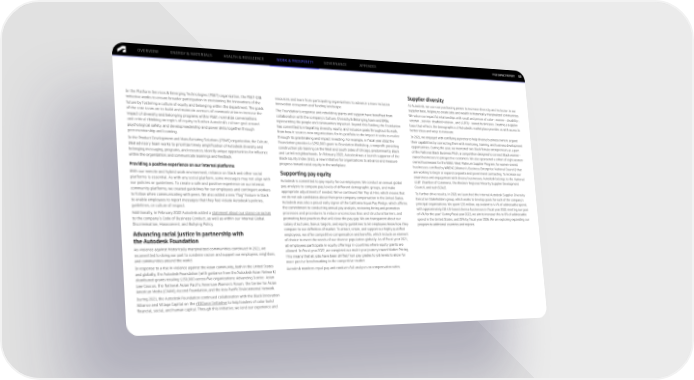 FY22 IMPACT REPORT OVERVIEW ENERGY & MATERIALS HEALTH & RESILIENCE WORK & PROSPERITY GOVERNANCE APPENDIX 53 Supplier diversity In the Platform Services & Emerging Technologies (PSET) organization, the PSET-DIB resources and learn from participating organizations to advance a more inclusive At Autodesk, we use our purchasing power to increase diversity and inclusion in our initiative works to ensure broader participation in envisioning the innovations of the innovation ecosystem and funding landscape. supplier base, helping to create jobs and wealth in historically marginalized communities. future by fostering a culture of equity and belonging within the department. The goals The Foundation’s response and rebuilding grants and support have benefited from We value our impactful relationships with small and person of color-, women-, disability-, of the core team are to build and maintain avenues of communication to increase the collaboration with the company’s Culture, Diversity & Belonging team and ERGs veteran-, service-disabled veteran-, and LGBTQ+-owned businesses. Creating a supplier impact of diversity and belonging programs within PSET, normalize conversations representing the people and communities impacted. Beyond this funding, the Foundation base that reflects the demographics of Autodesk’s marketplace provides us with access to and critical thinking on topics of equity to further Autodesk’s culture goal around has committed to integrating diversity, equity, and inclusion goals throughout its work, better ideas and ways to innovate. psychological safety, and develop leadership and power skills together through from how it sources new organizations for its portfolio to the impact it seeks to realize In 2021, we engaged with certifying agencies to help diverse business owners expand peer mentorship and learning. through its grantmaking and impact investing. For example, in fiscal year 2022 the their capabilities by connecting them with mentoring, training, and business development In the Product Development and Manufacturing Solutions (PDMS) organization, the Culture, Foundation provided a $250,000 grant to Revolution Workshop, a nonprofit providing opportunities. During the year, we mentored two Black female entrepreneurs as a part D&B advisory team works to prioritize timely amplification of Autodesk diversity and construction job training on the West and South Sides of Chicago, predominantly Black of the National Black Business Pitch, a competition designed to connect Black women– belonging messaging, programs, and resources; identify unique opportunities for influence and LatinX neighborhoods. In February 2022, Autodesk was a launch supporter of the owned businesses to prospective customers. We also sponsored a cohort of eight women- within the organization; and communicate learnings and feedback. Black Equity Index (BEI), a new initiative for organizations to advance and measure owned businesses for the WBEC-West Platinum Supplier Program, for women-owned Providing a positive experience on our internal platforms progress toward racial equity in the workplace. businesses certified by WBENC (Women’s Business Enterprise National Council) that Supporting pay equity are working to begin or expand corporate and government contracting. To increase our With our remote and hybrid work environment, reliance on Slack and other social awareness and engagement with diverse businesses, Autodesk belongs to the National platforms is essential. As with any social platform, some messages may not align with Autodesk is committed to pay equity for our employees. We conduct an annual global LGBT Chamber of Commerce, the Western Regional Minority Supplier Development our policies or guidelines. To create a safe and positive experience on our internal pay analysis to compare pay levels of different demographic groups, and make Council, and tech:SCALE. community platforms, we created guidelines for our employees and contingent workers appropriate adjustments if needed. We’ve continued Fair Pay at Hire, which means that To further drive results, in 2021 we launched the internal Autodesk Supplier Diversity to follow when communicating with peers. We also added a new “flag” feature in Slack we do not ask candidates about their prior company compensation in the United States. Executive Stakeholders group, which works to develop goals for each of the company’s to enable employees to report messages that they feel violate Autodesk’s policies, Autodesk was also a proud early signer of the California Equal Pay Pledge, which affirms principal organizations. We spent $35 million, equivalent to 4.4% of addressable spend, guidelines, or culture of respect. the commitment to conducting annual pay analysis, reviewing hiring and promotion with approximately 210 US-based diverse businesses in fiscal year 2022, meeting our goal Additionally, in February 2022 Autodesk added a statement about our stance on racism processes and procedures to reduce unconscious bias and structural barriers, and 2 of 4% for the year. During fiscal year 2023, we aim to increase this to 8% of addressable to the company’s Code of Business Conduct, as well as within our internal Global promoting best practices that will close the pay gap. We are transparent about our spend in the United States, and 25% by fiscal year 2026. We are exploring expanding our Discrimination, Harassment, and Bullying Policy. salary structures, bonus targets, and equity guidelines to let employees know how they program to additional countries and regions. Advancing racial justice in partnership with compare to our definition of market. To attract, retain, and support our highly qualified employees, we offer competitive compensation and benefits, which include an element the Autodesk Foundation of choice to meet the needs of our diverse population globally. As of fiscal year 2021, As violence against historically marginalized communities continu