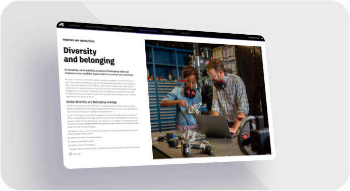 FY22 IMPACT REPORT OVERVIEW ENERGY & MATERIALS HEALTH & RESILIENCE WORK & PROSPERITY GOVERNANCE APPENDIX 48 Improve our operations Diversity and belonging At Autodesk, we’re building a culture of belonging where all employees have equitable opportunities to succeed and contribute. We strive to create an environment where everyone, everywhere, is excited to come to work, feels a sense of belonging, and can fully contribute their talents in the workplace. We’re creating a workplace that embraces a multitude of original minds and talents to create the most innovative products and solutions that meet the demands of the global marketplace. By cultivating a workplace where all employees can realize their potential, we offer more than just a place to work. As a company leading change, we’re creating opportunities for people to thrive. Global diversity and belonging strategy In 2020, we launched a major initiative to revamp our global diversity and belonging strategy and implement an ecosystem approach that focuses on individual, interpersonal, and structural dimensions of change and transformation. As part of this process, we invited employees from more than 25 countries and over 44 offices—representing all levels and functions and a rich mix of demographics—to join focus groups to share their feedback, ideas, and experiences. In addition, we engaged our top executives through a strategy advisory group and analyzed data that reflect many different aspects of diversity and belonging. Through this process, we set three-year objectives and aspirational goals for each of these strategic change levers: ● Attract and retain a diverse workforce ● Expand leadership diversity ● Foster a culture of belonging Through a data-driven approach, we are building our programs and measuring success. Learn more